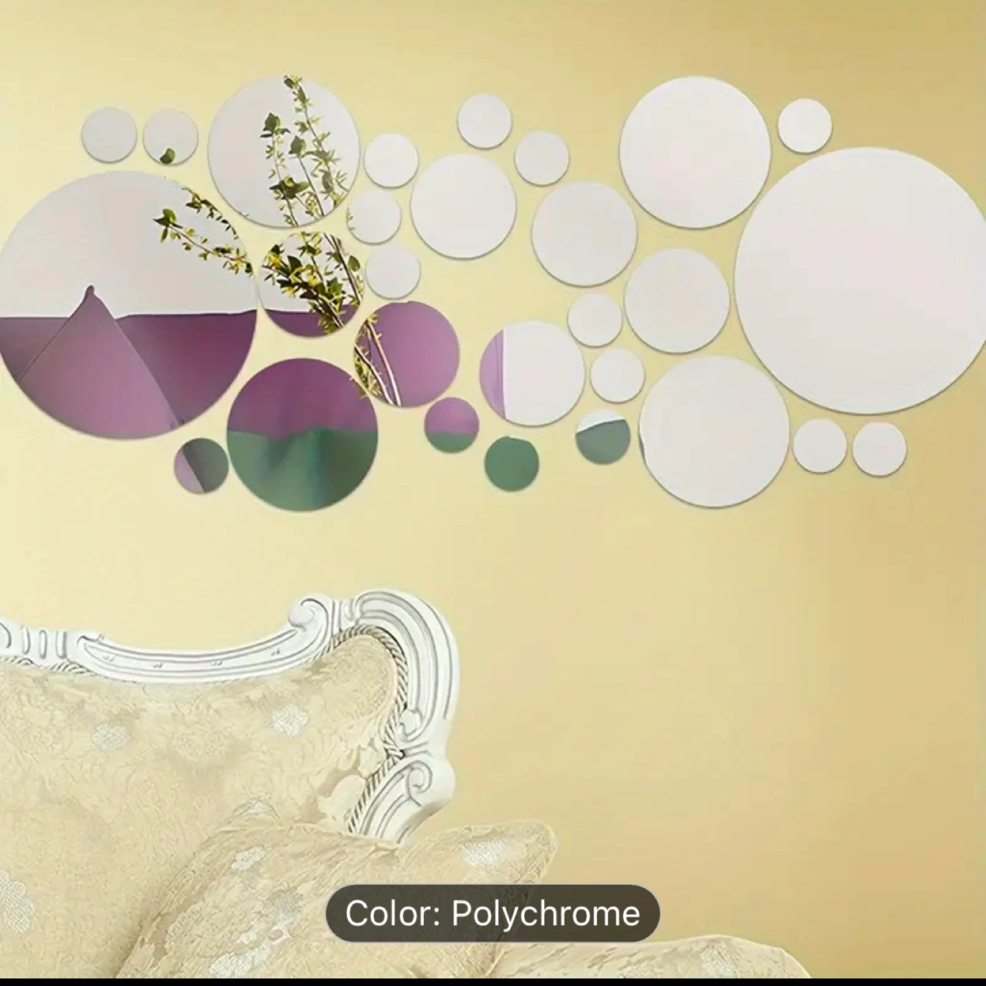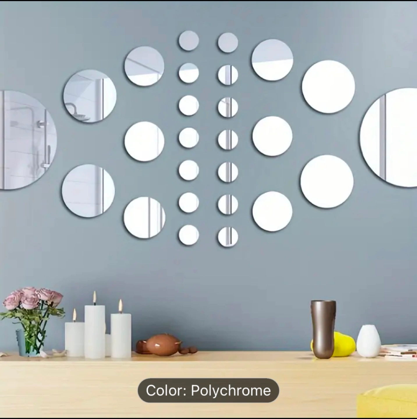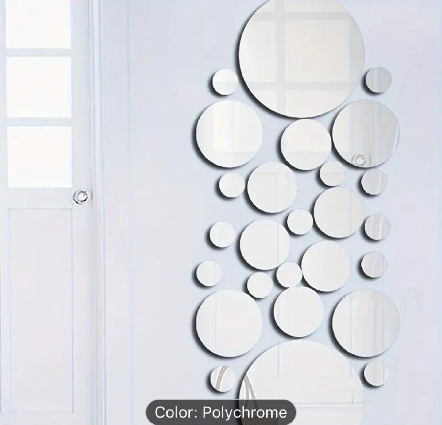 Decorative wall decals. Multiple sizes and quantities of round mirror stickers. Easy peel and stick application. Great for home décor. Polychrome colour.