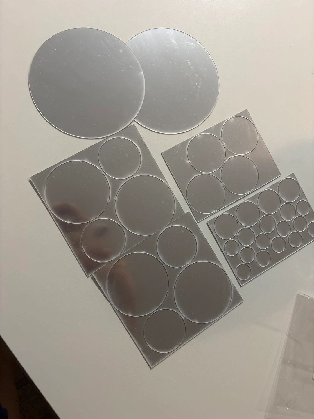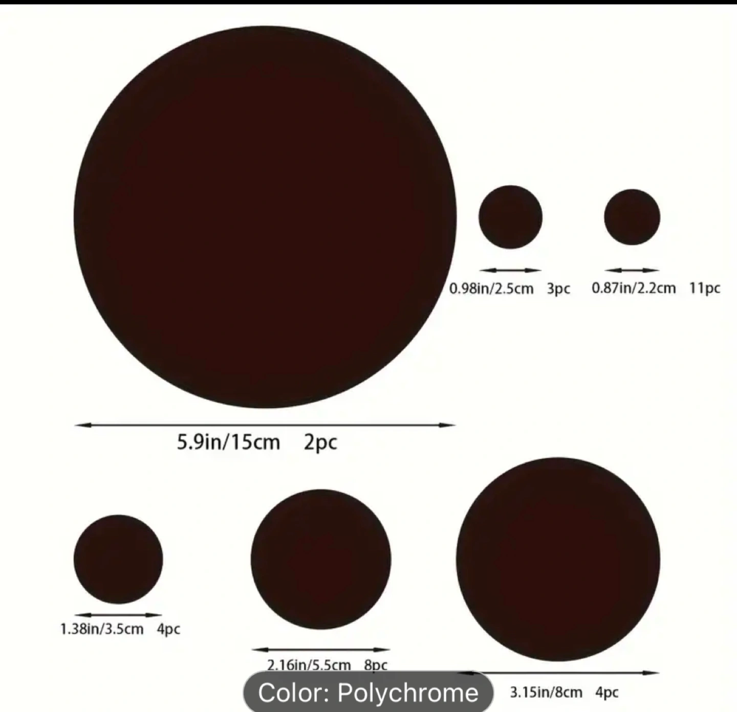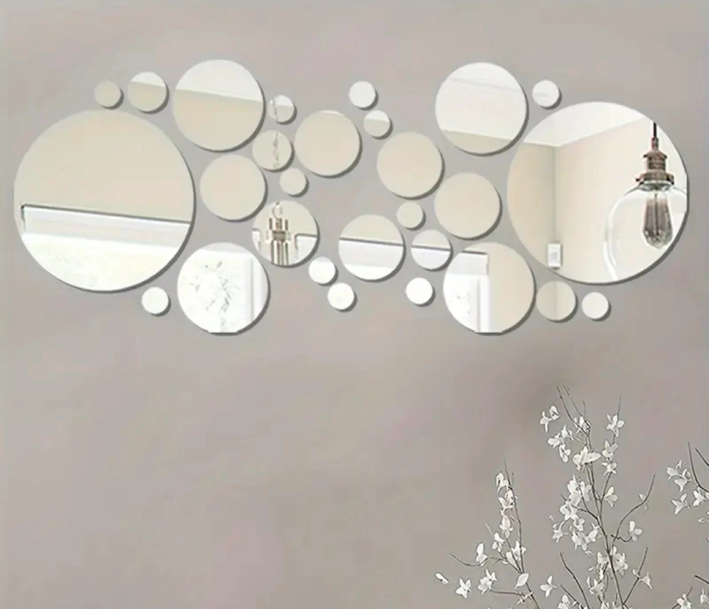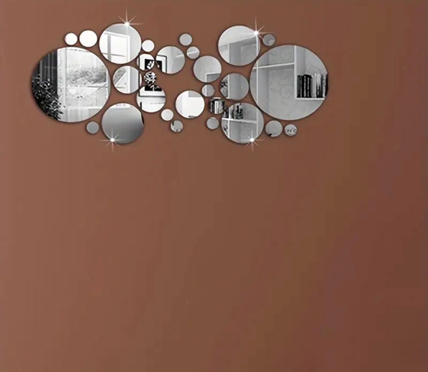 Decorative wall decals. Multiple sizes and quantities of round mirror stickers. Easy peel and stick application. Great for home décor. Polychrome colour.