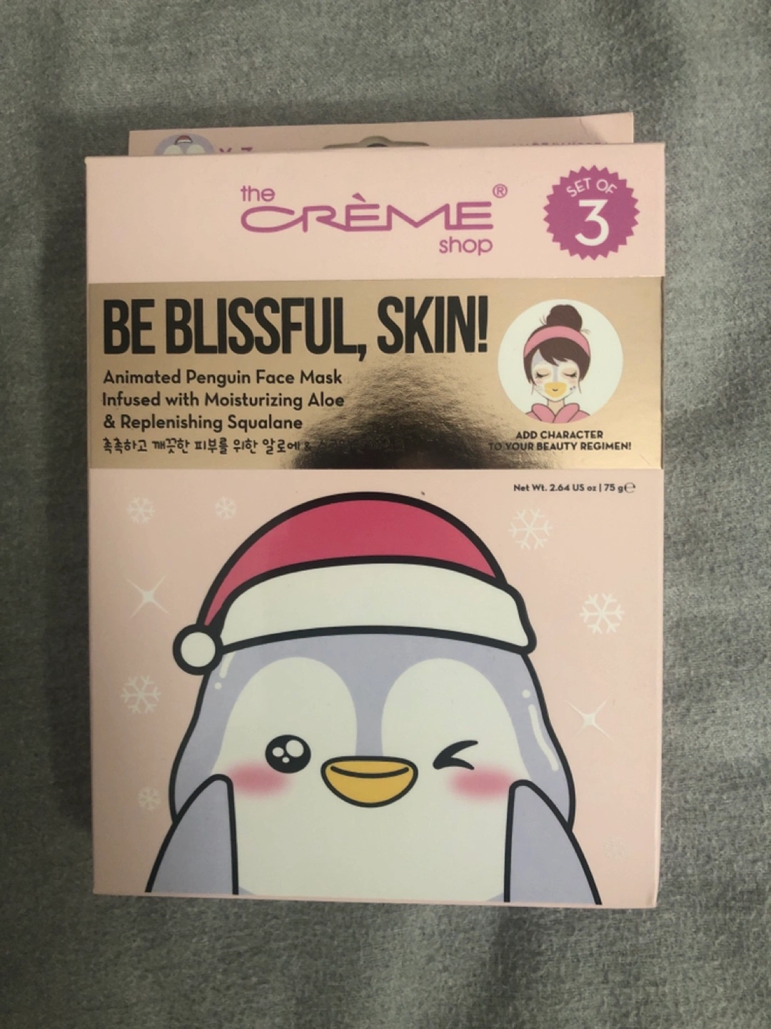 Set of three animated penguin face masks. Infused with moisturizing aloe and replenishing squalane. For external use only. Avoid contact with eyes or irritated skin. Brand new box