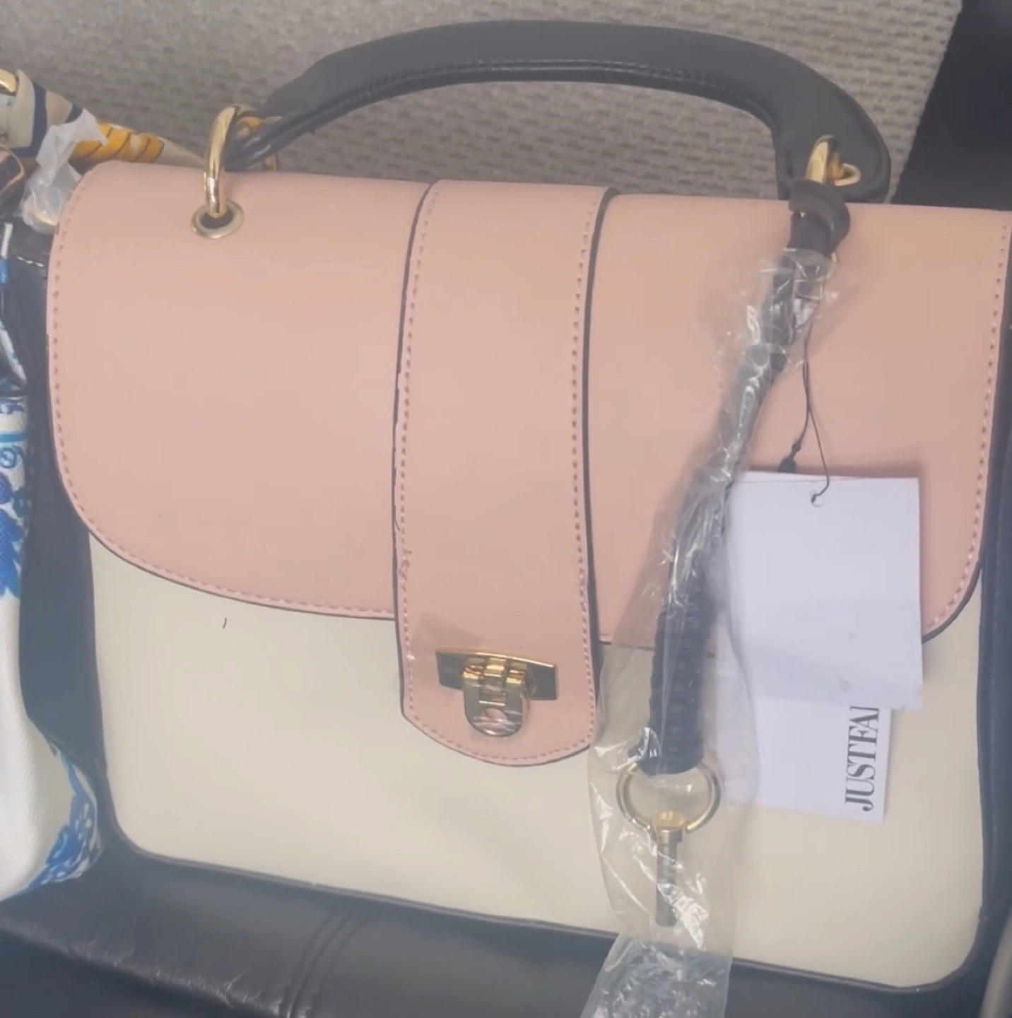 118Stylish two-tone satchel bag. Features a pink and cream colour block design, gold-toned hardware, and a top handle. Includes a detachable strap. New with tags.