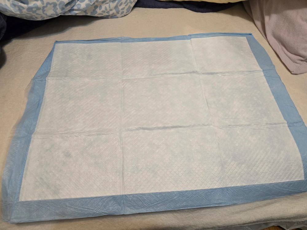 Large quantity of absorbent pet training pads. Blue border. Ideal for pets or incontinence. Absorbent and leak-proof. Perfect for large dogs or multiple pets.
