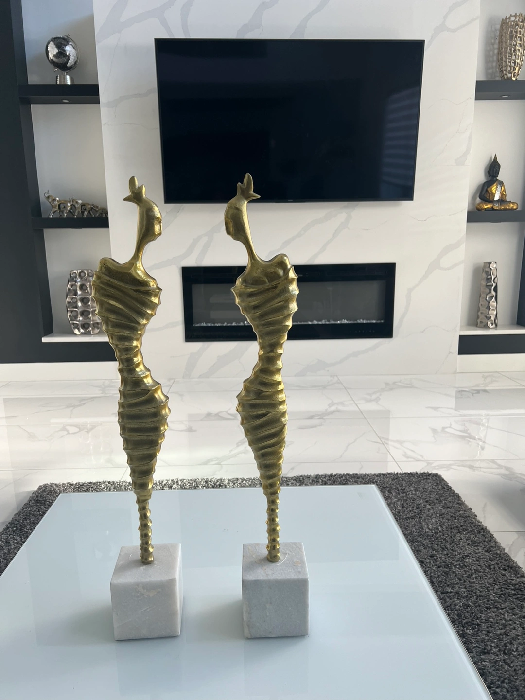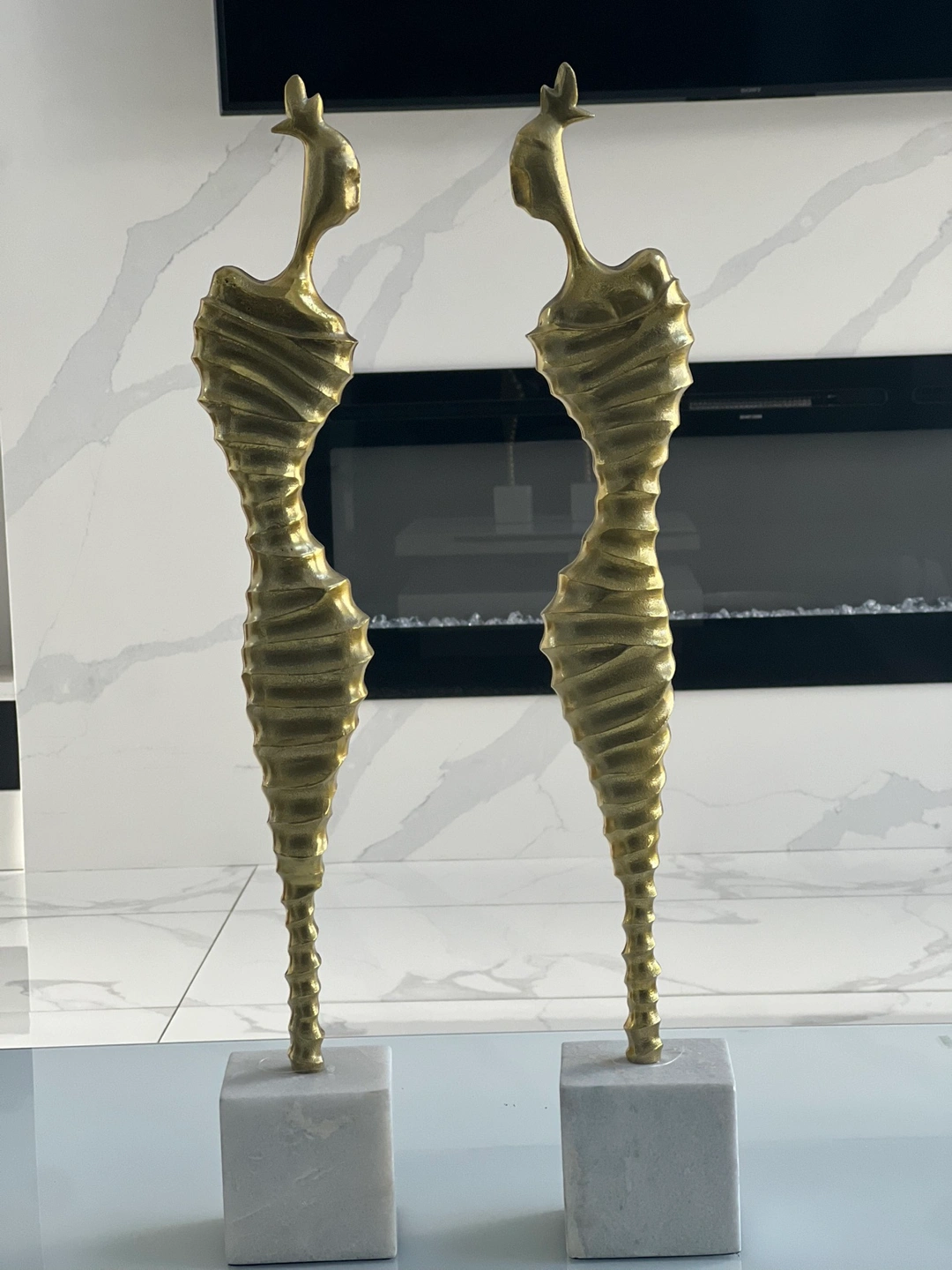 Elegant gold-toned metal sculptures. Abstract design. Features a unique textured finish. Each stands on a small white marble base. Modern and stylish decor.