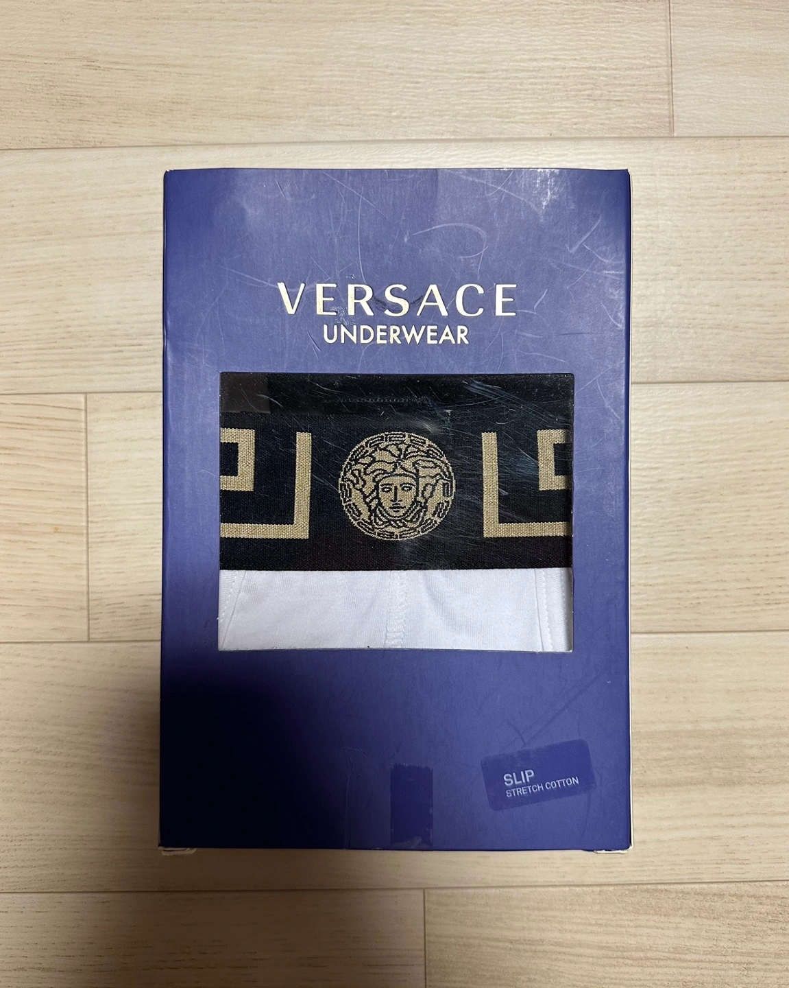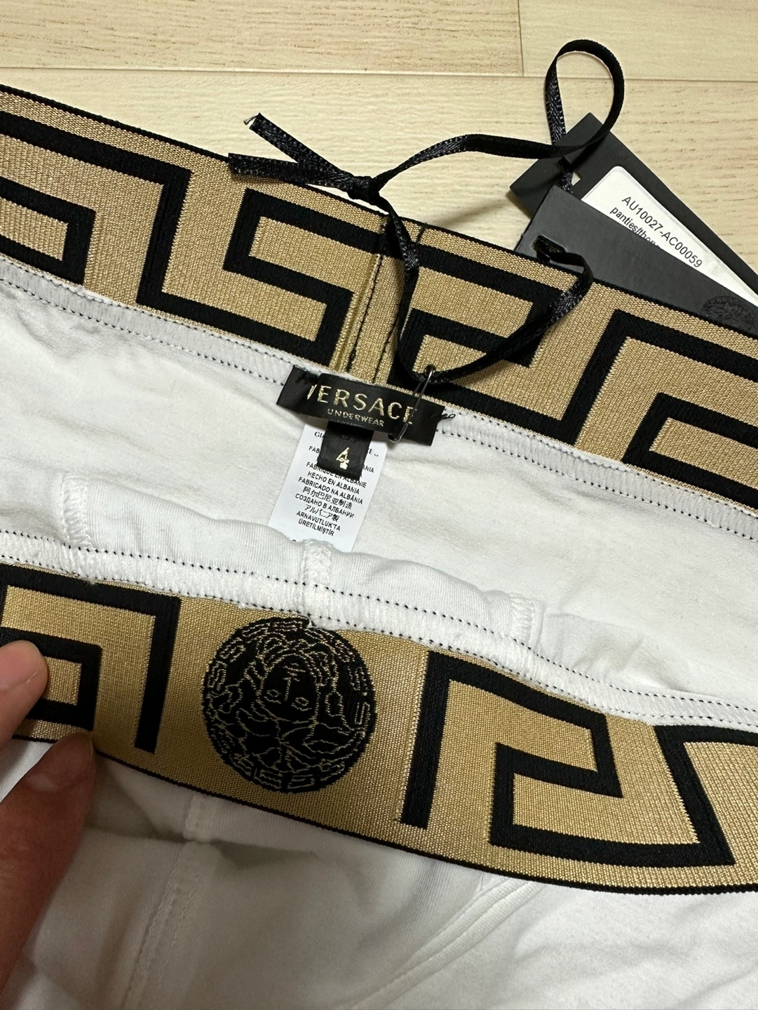 New with tags. Men's size medium white cotton slip. Features gold Greek key design. Comes in original Versace packaging.