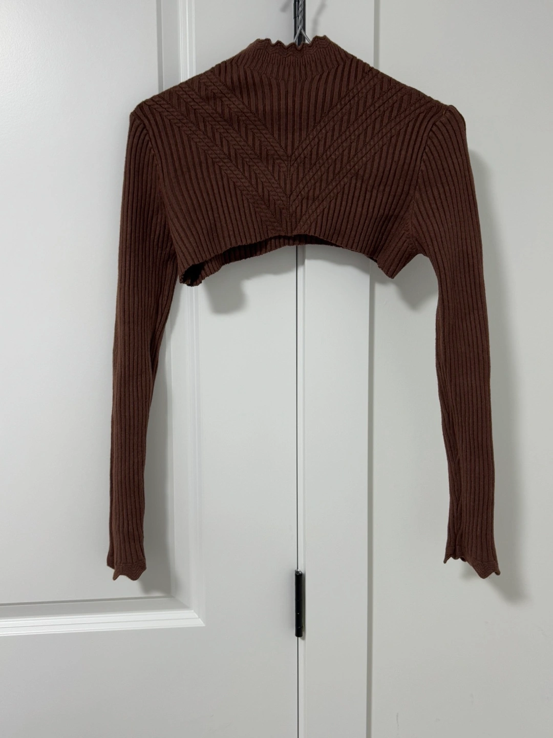 39Brown cropped long-sleeved sweater. Mock neck. Ribbed knit. Chevron pattern detail at neckline.