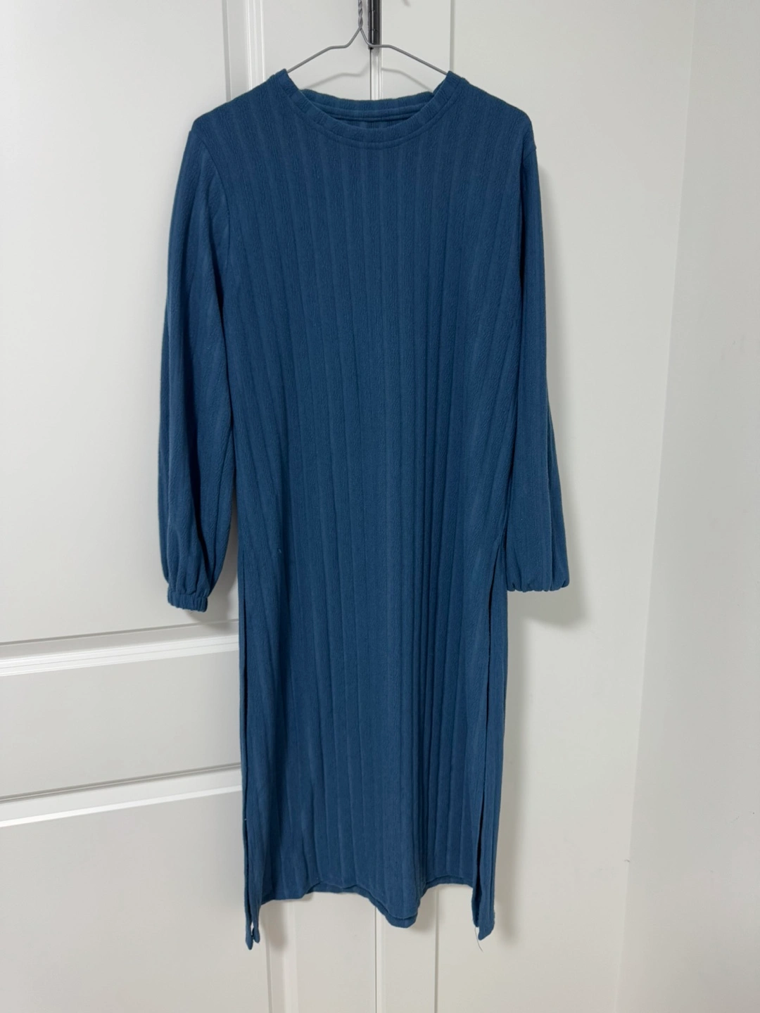 39Simple blue mini dress. Ribbed knit material. Three-quarter sleeves. Side slits. Relaxed fit.
