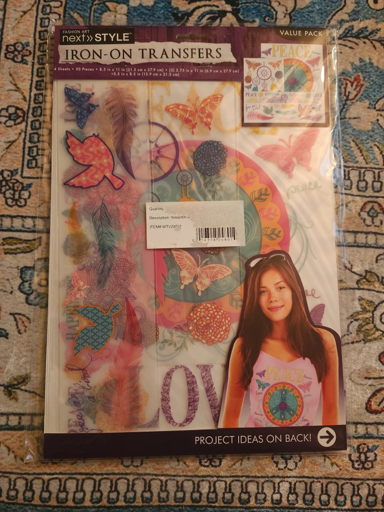 Iron-on transfers. Features 50 pieces on four sheets. Bohemian/hippie theme. Includes butterflies, birds, feathers, peace signs, and more. Great for clothing and crafts.