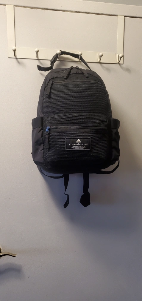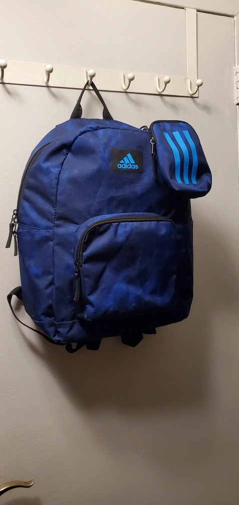 Blue Adidas backpack. Features a small matching pouch. Multiple zippered compartments. Ideal for school or everyday use.