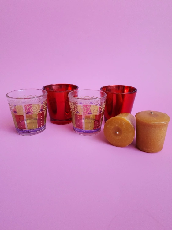Four votive holders, two red and two decorated glass. Two scented votive candles included. Perfect for adding ambiance to your home.