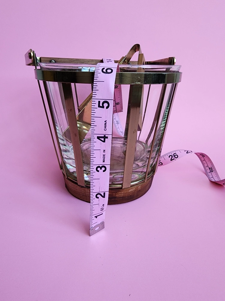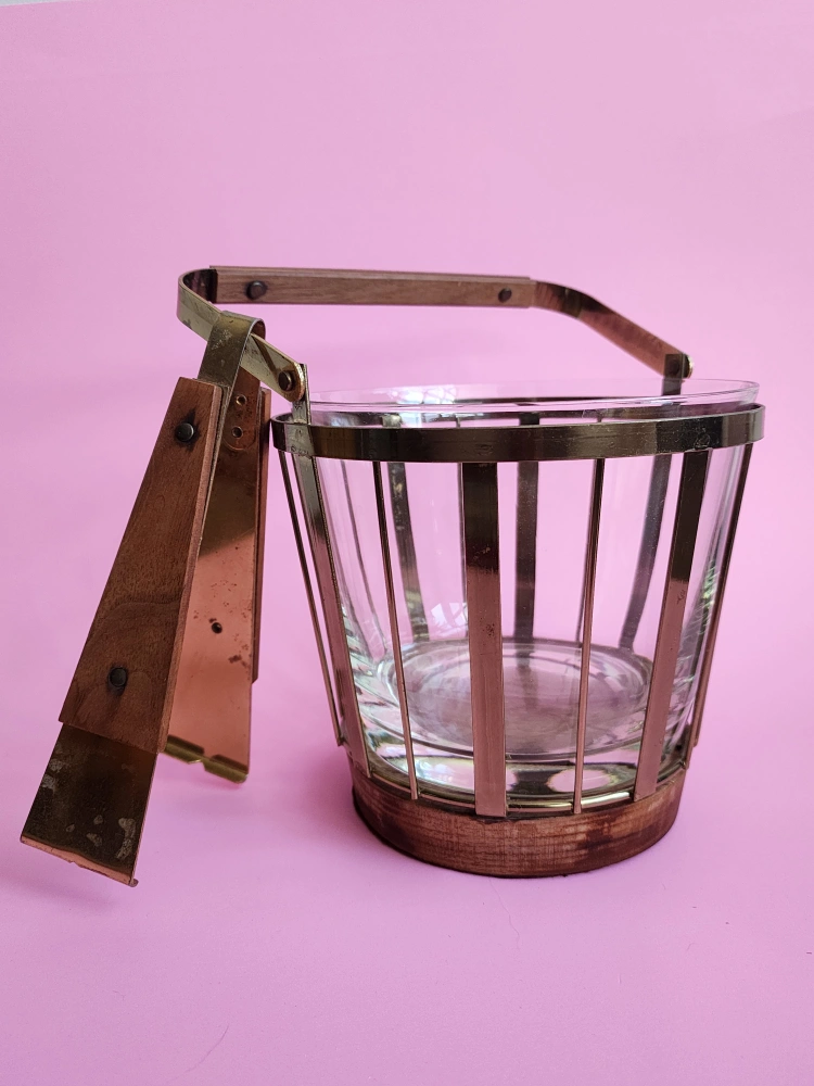 Vintage ice bucket. Brass frame, glass liner, wooden base. Includes matching tongs. Great for entertaining or adding a retro touch to your bar. Brass details are a bit worn off. No lowballers, please. Price is fixed.