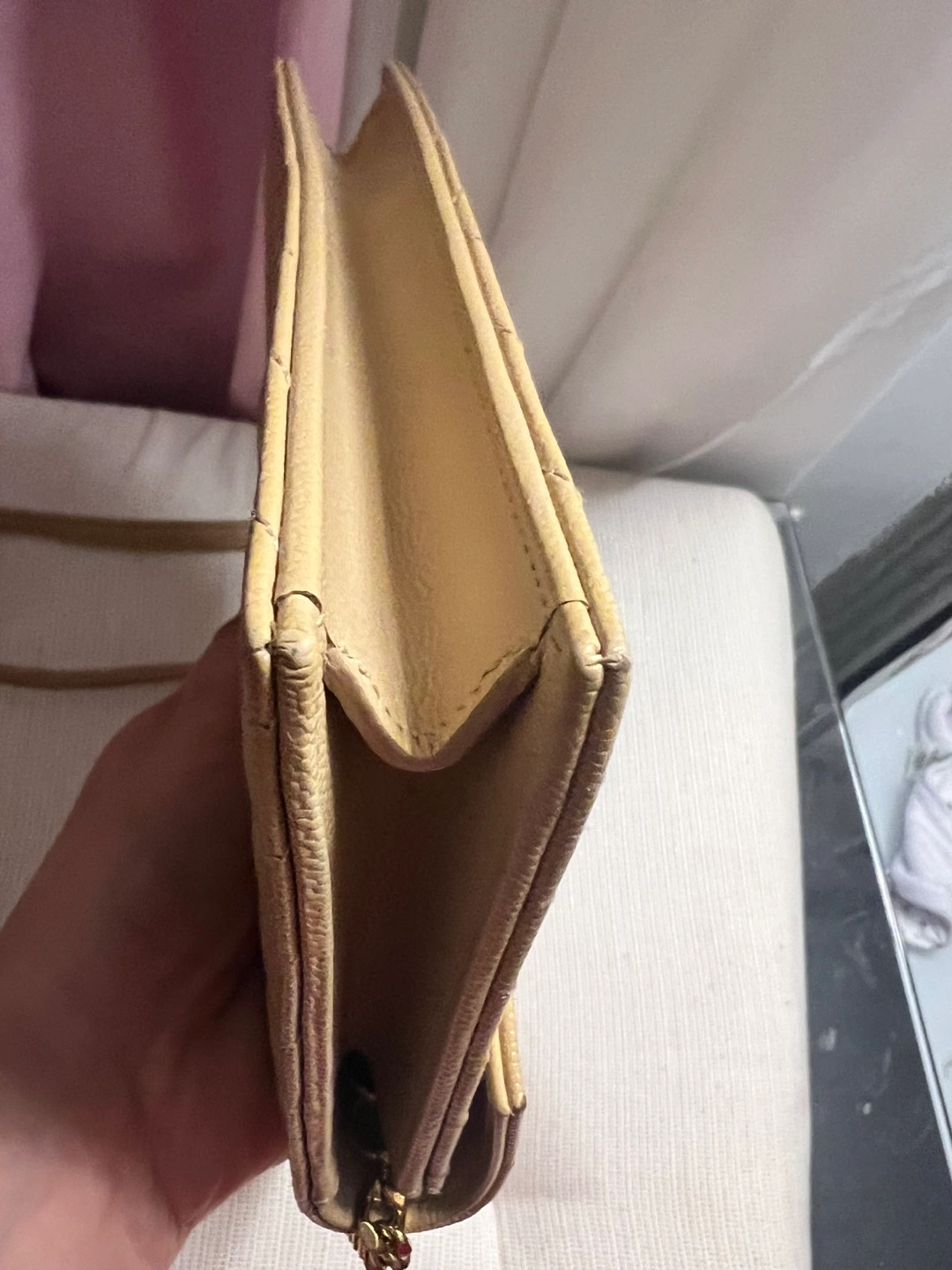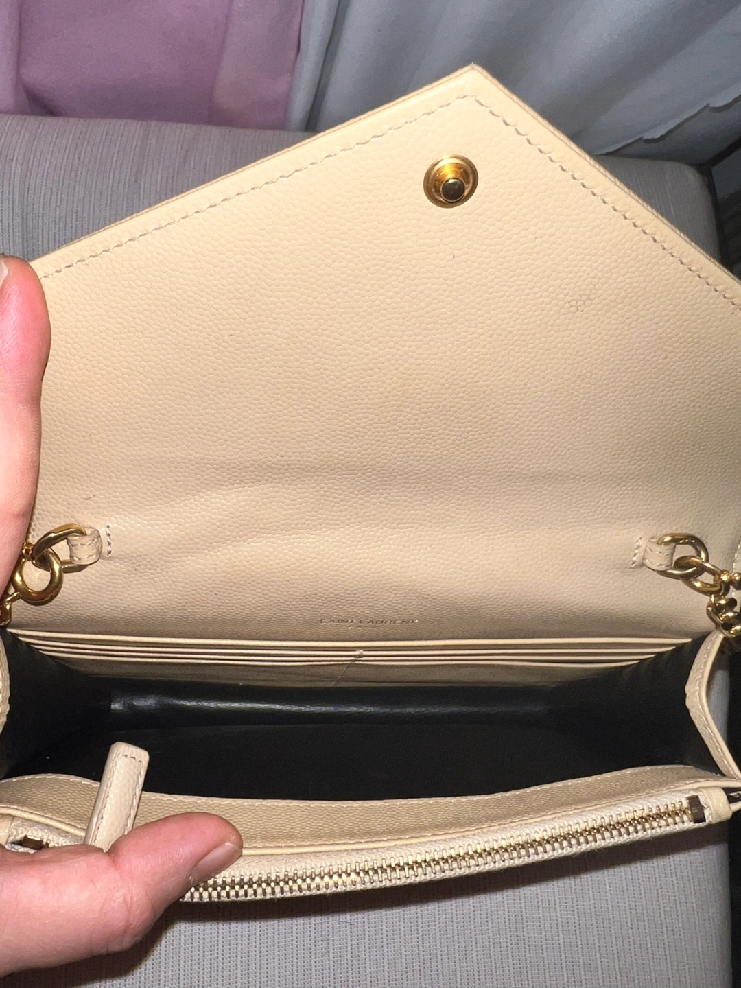 authentic Beige leather wallet on chain. Features gold-tone hardware and iconic YSL logo. Includes dust bag. Zipper closure.