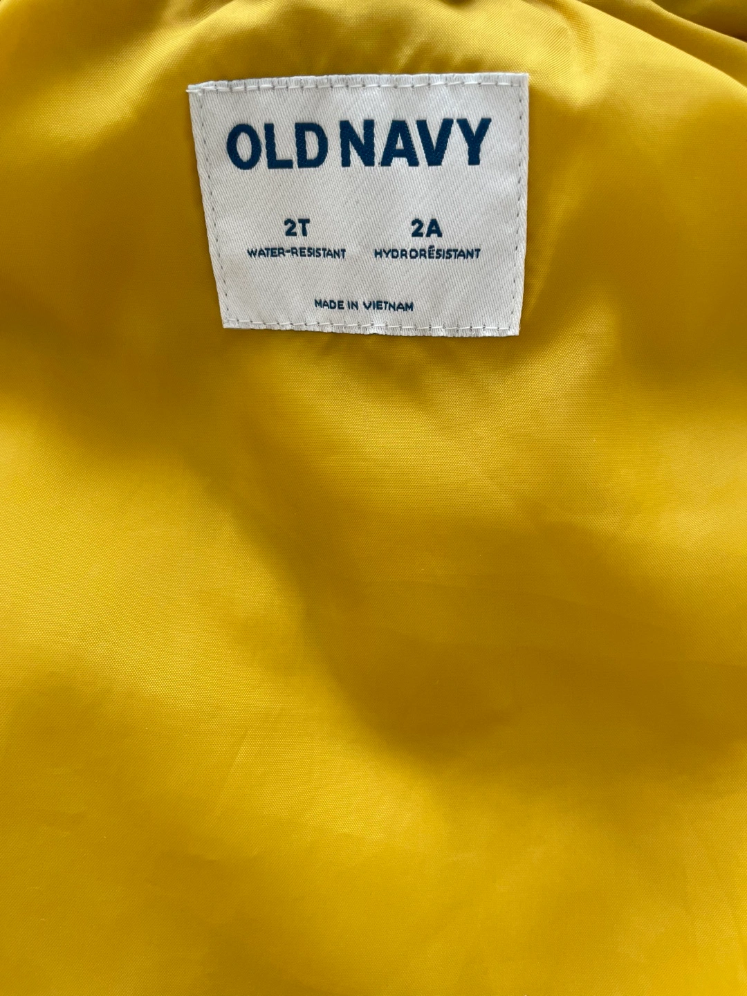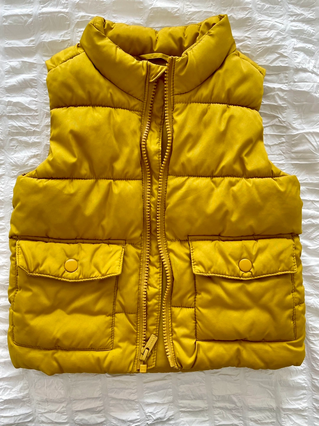 Adorable mustard yellow puffer vest. Water-resistant. Two front pockets. Great for layering. Size 2T.