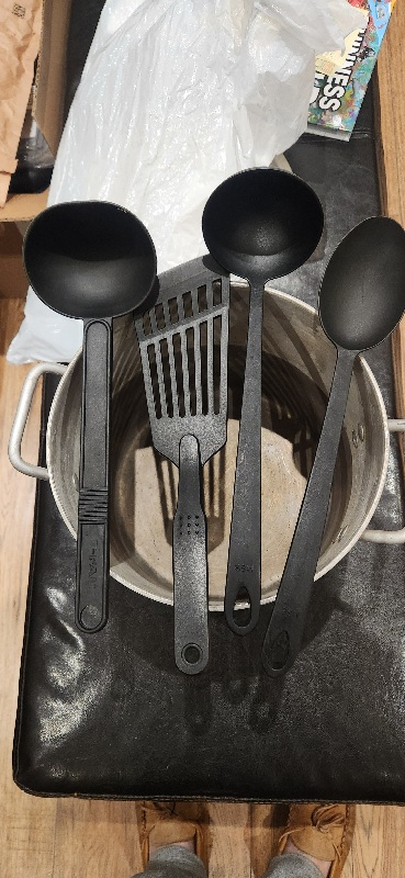 Four black nylon kitchen utensils. Includes a slotted spoon, a ladle, a soup ladle, and a spatula. All in good condition. One piece Aluminum stock pot with lid. 12qrts.
