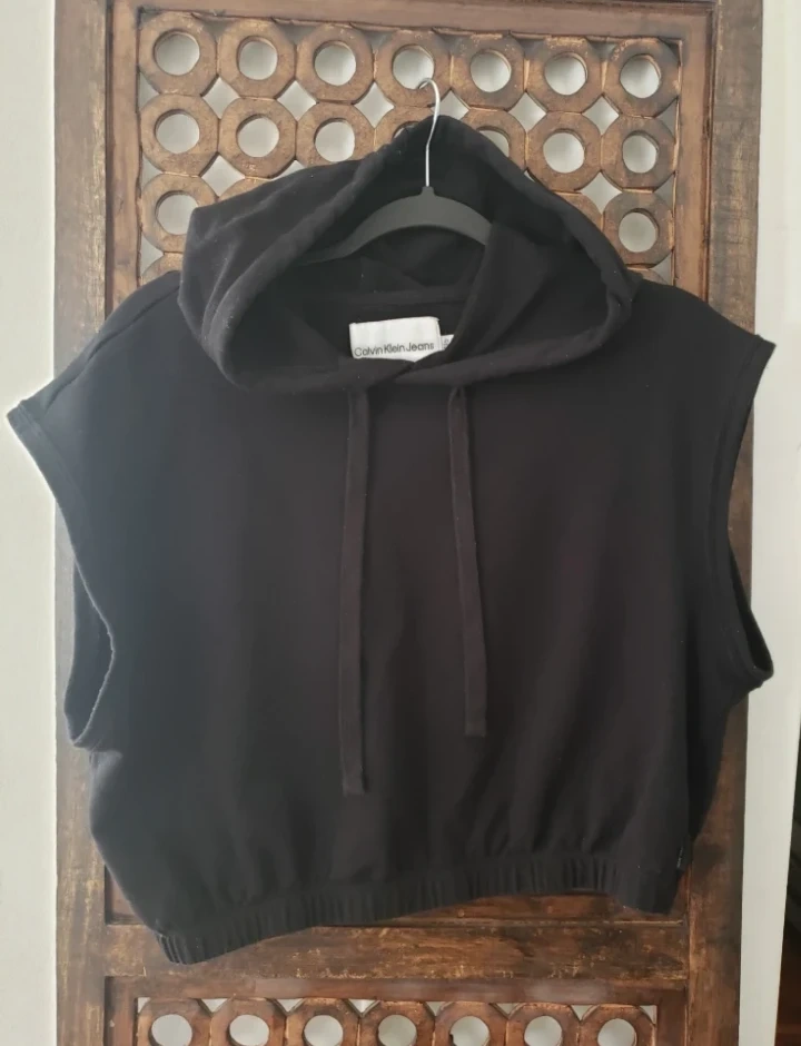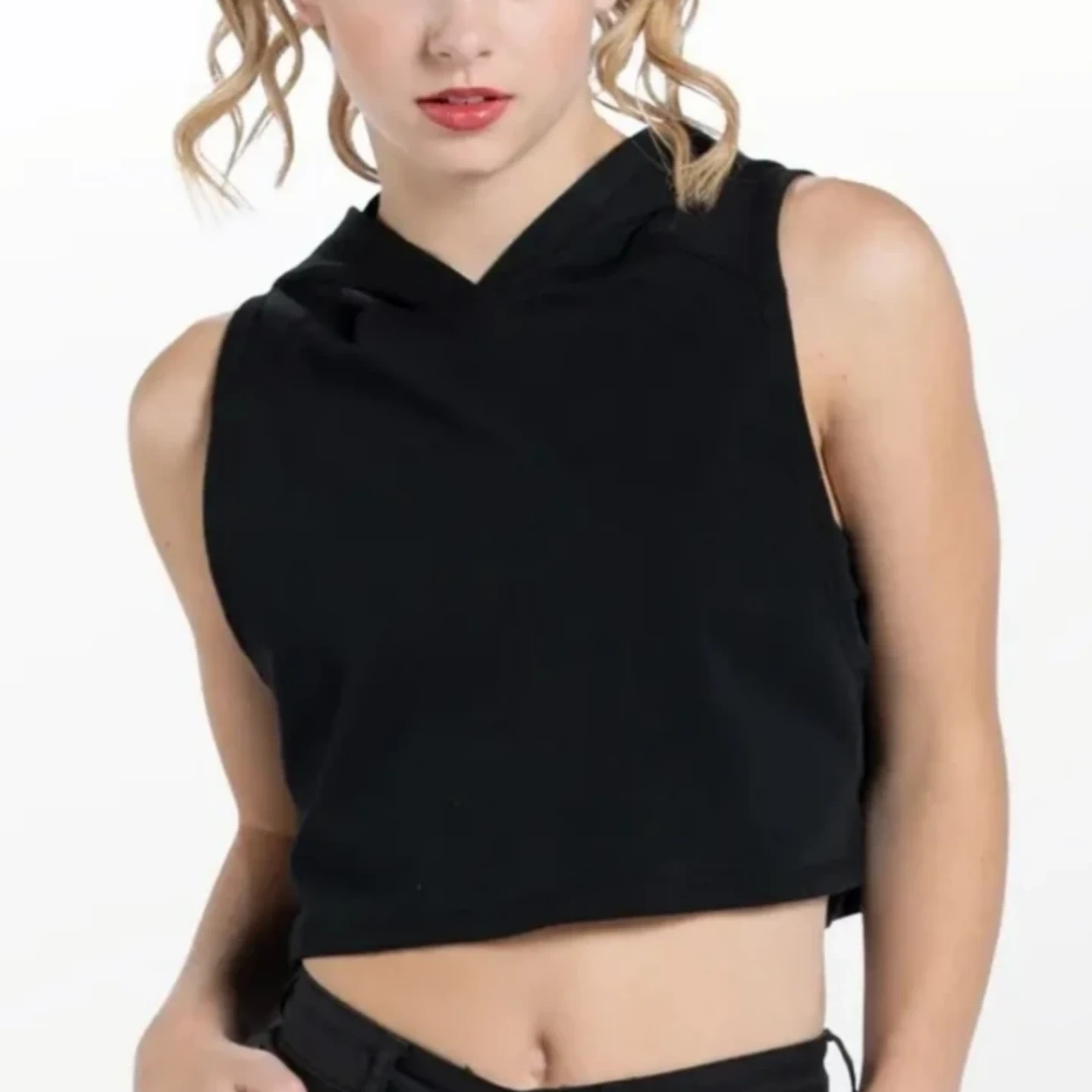 Black cropped sleeveless hoodie. Drawstring hood and elastic waistband.