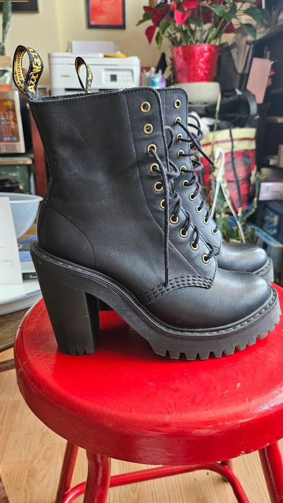Women's black leather Kendra boots. Lace-up, "granny" style, chunky 3 1/2" heel. Never been worn. Were accidentally bought a size too small and not noticed until it was too late. Look heavy, but light when walking, thanks to the, as advertised, Bouncing Soles. $90 OBO. Great find! Available for pick-up near Oakwood Village.