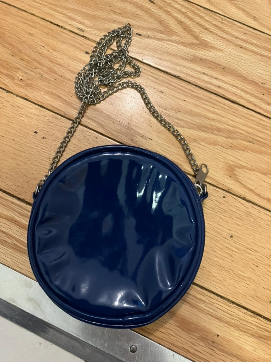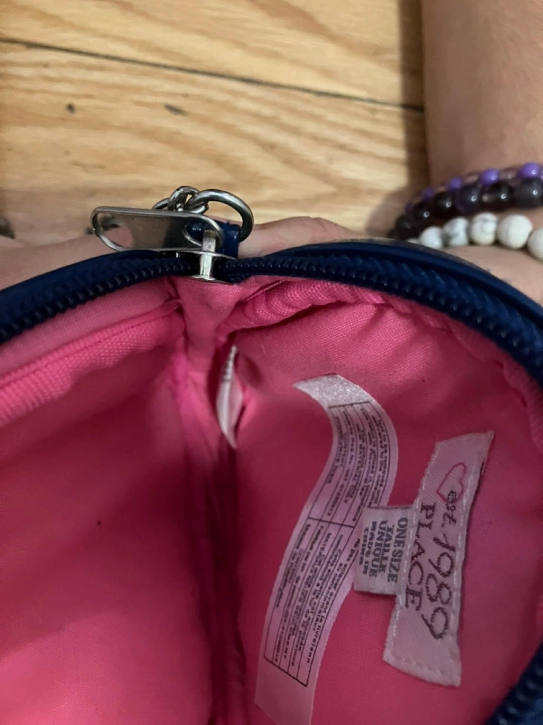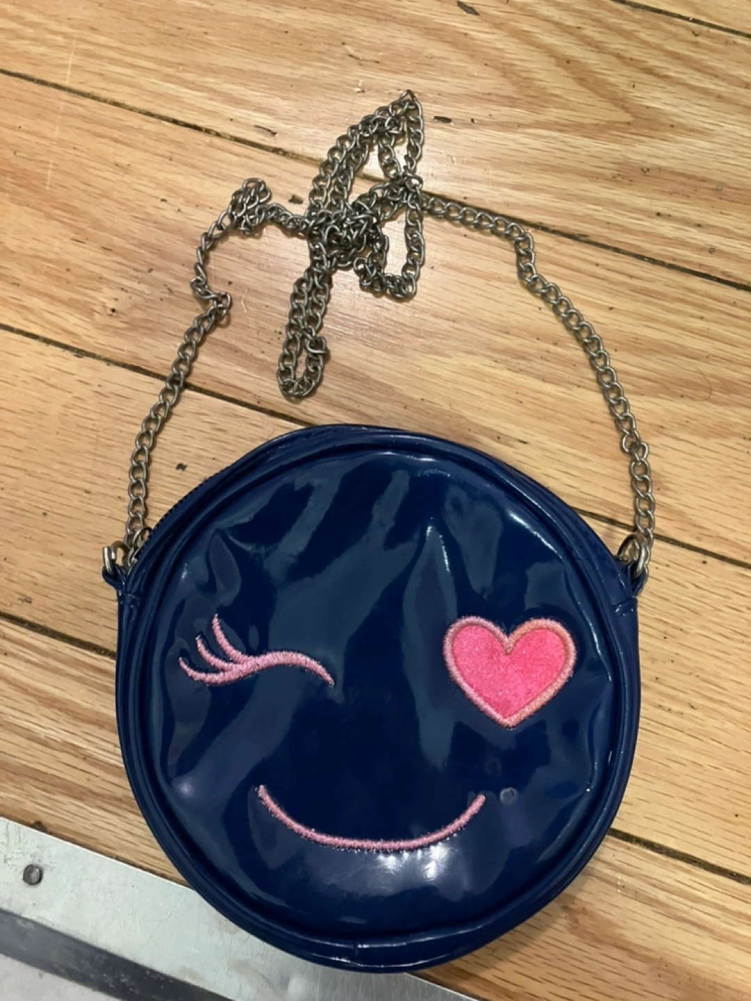 Cute navy blue crossbody bag. Features a winking face with a pink heart. Shiny patent material. Silver chain strap. Zipper closure. Small size, perfect for essentials.