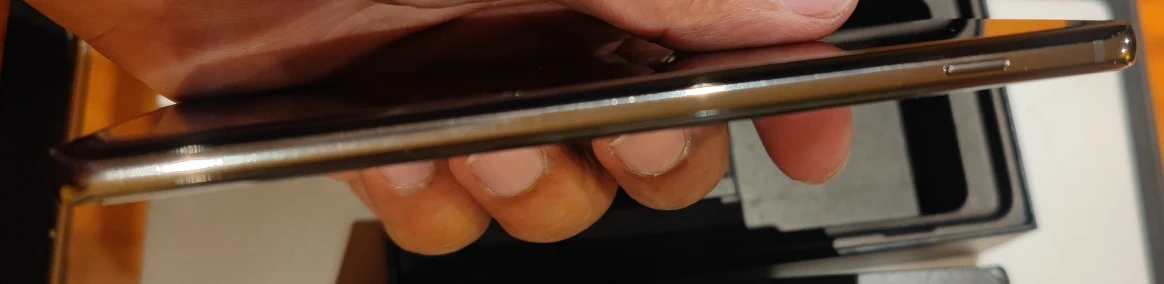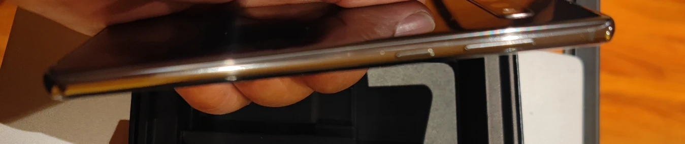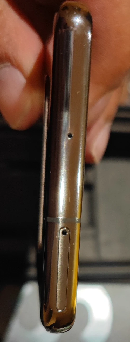 Has a slight crack in the right side of the screen that is barely visible and doesn't affect anything (see attached picture). In very good condition. No dents or issues