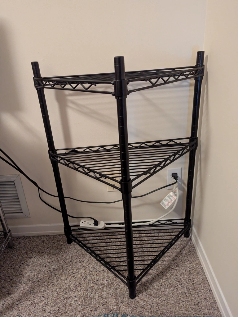 Small black metal shelving unit, 3 shelves at a height of approximately 33 inches, each shelf is approximately 23 inches on the back side and 16