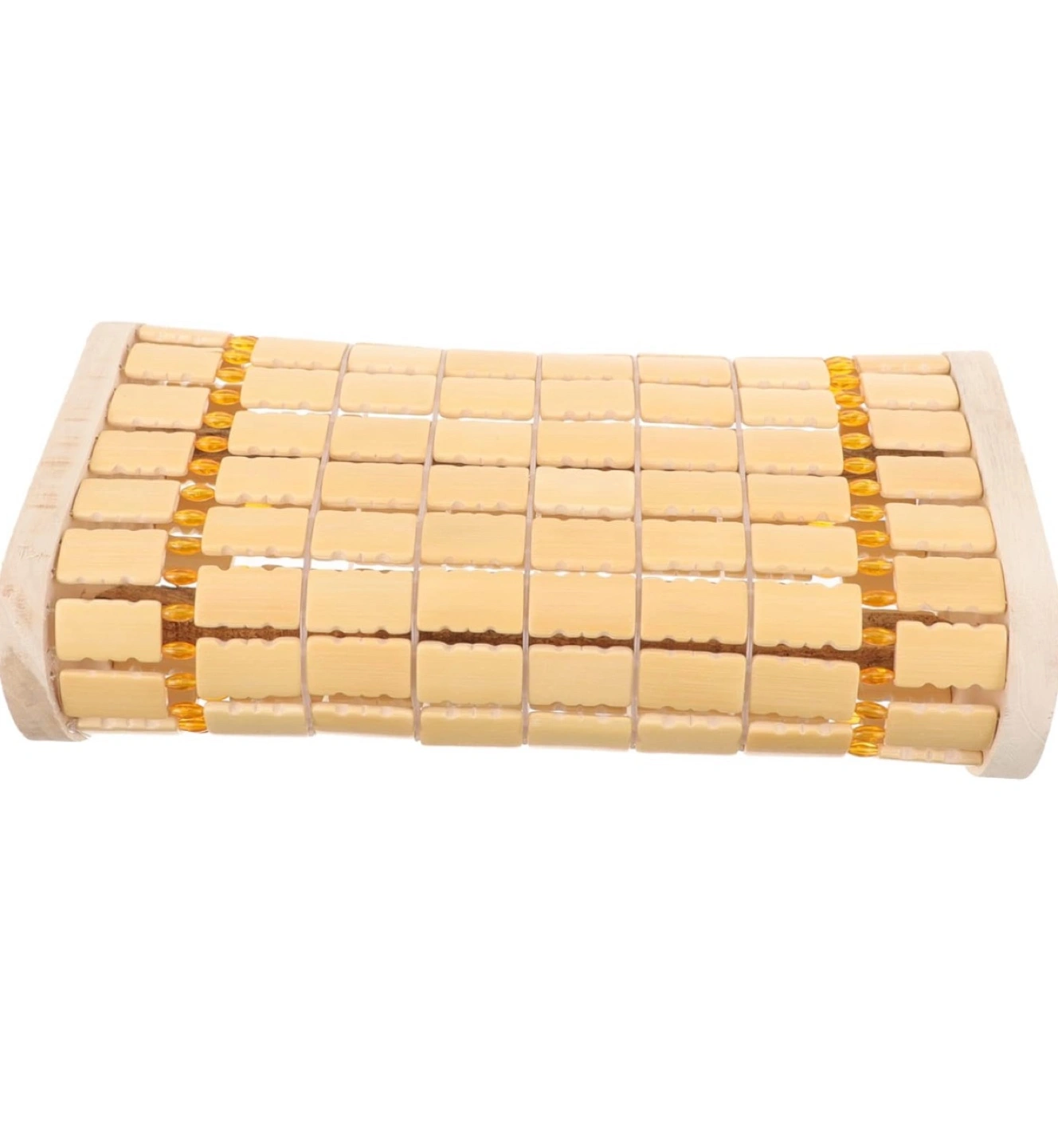 145Handmade bamboo pillow. Comfortable for neck and lumbar support. Great for home use, saunas, or steam rooms. Features small amber beads along the sides.