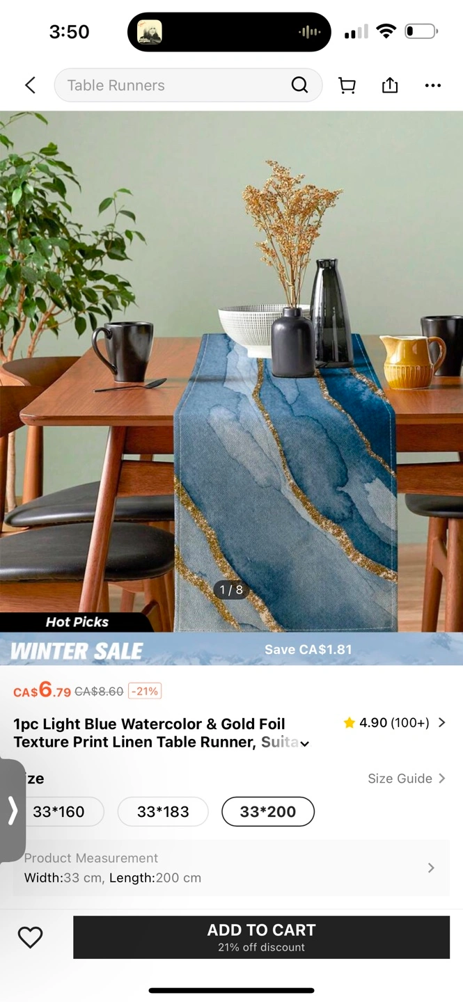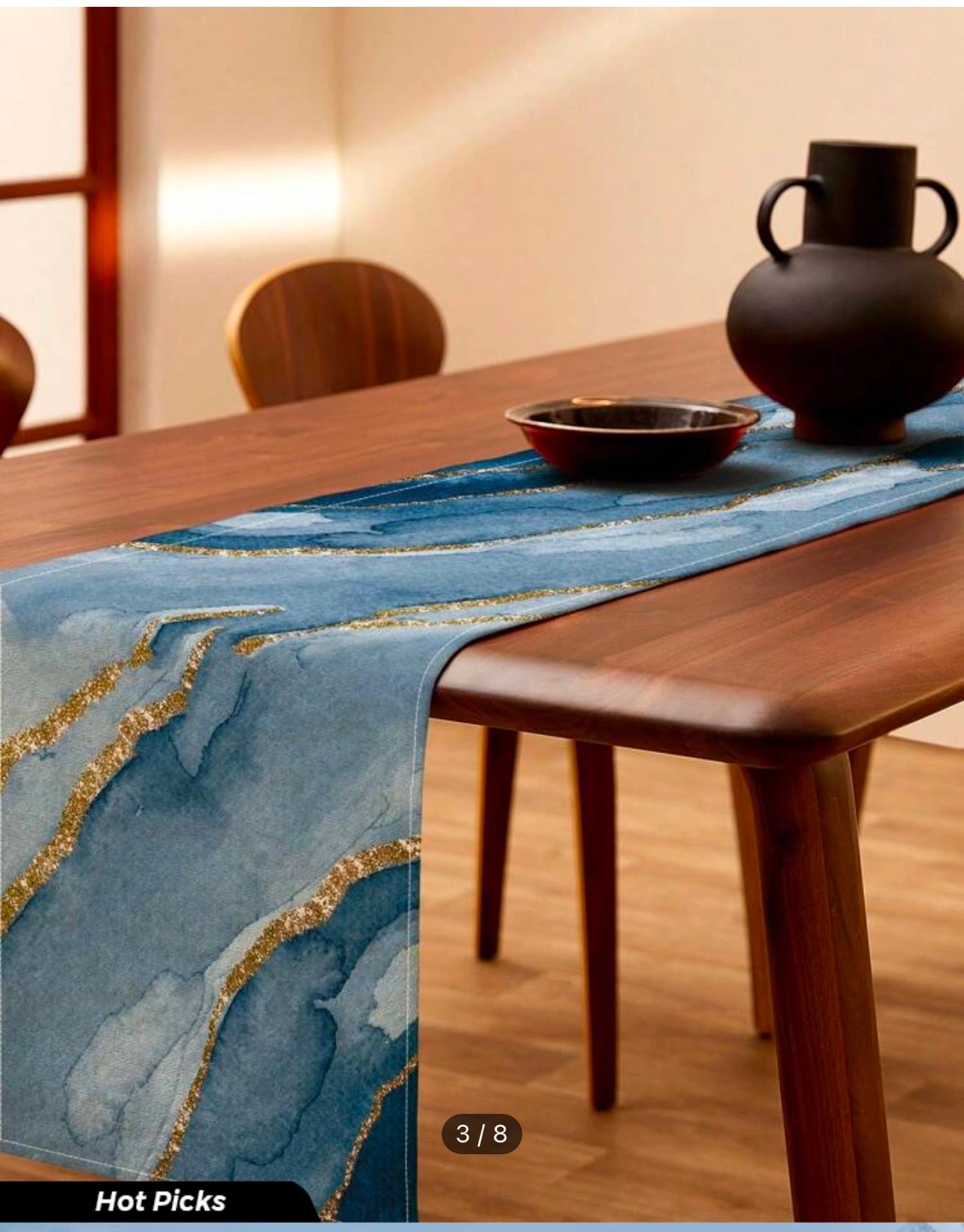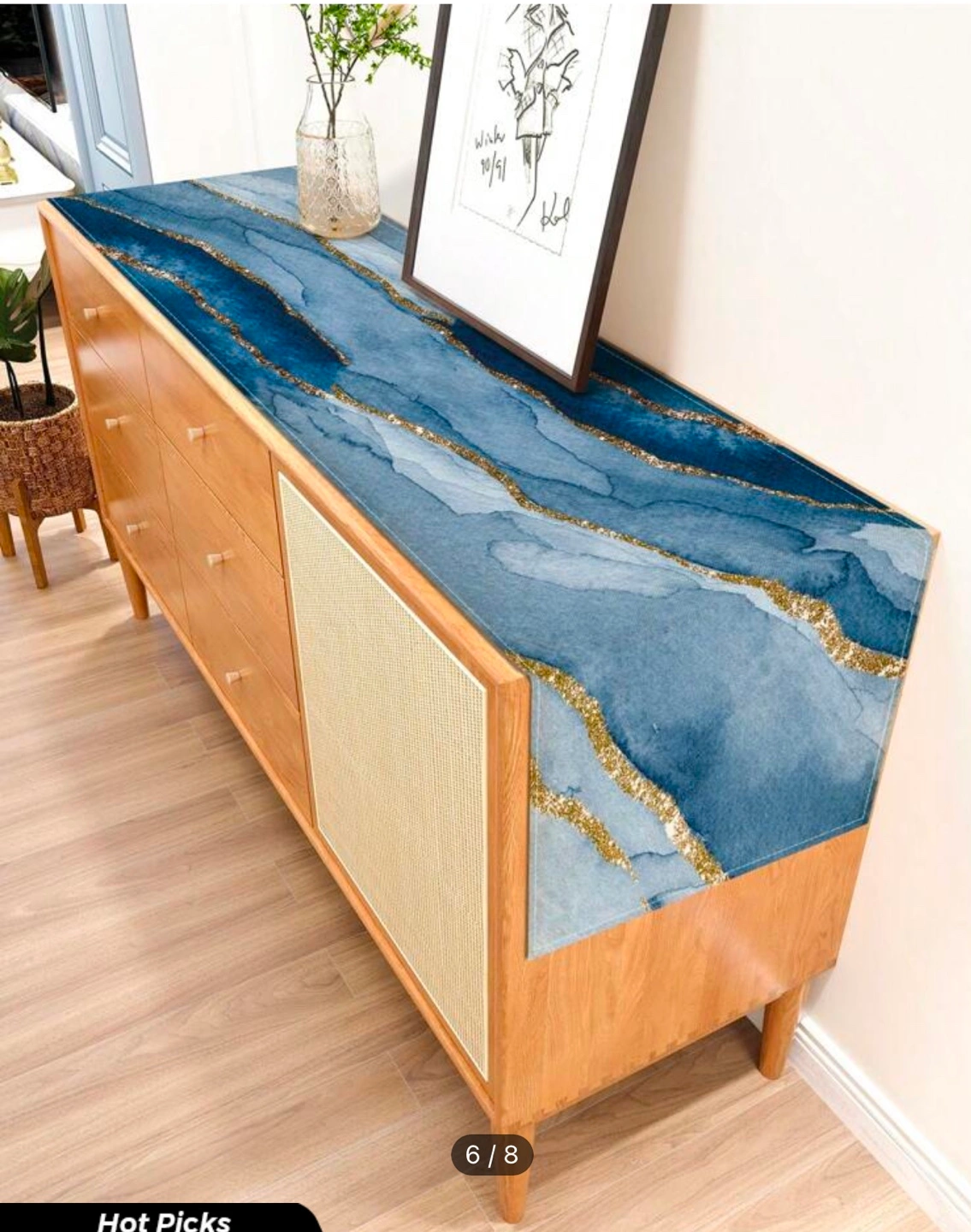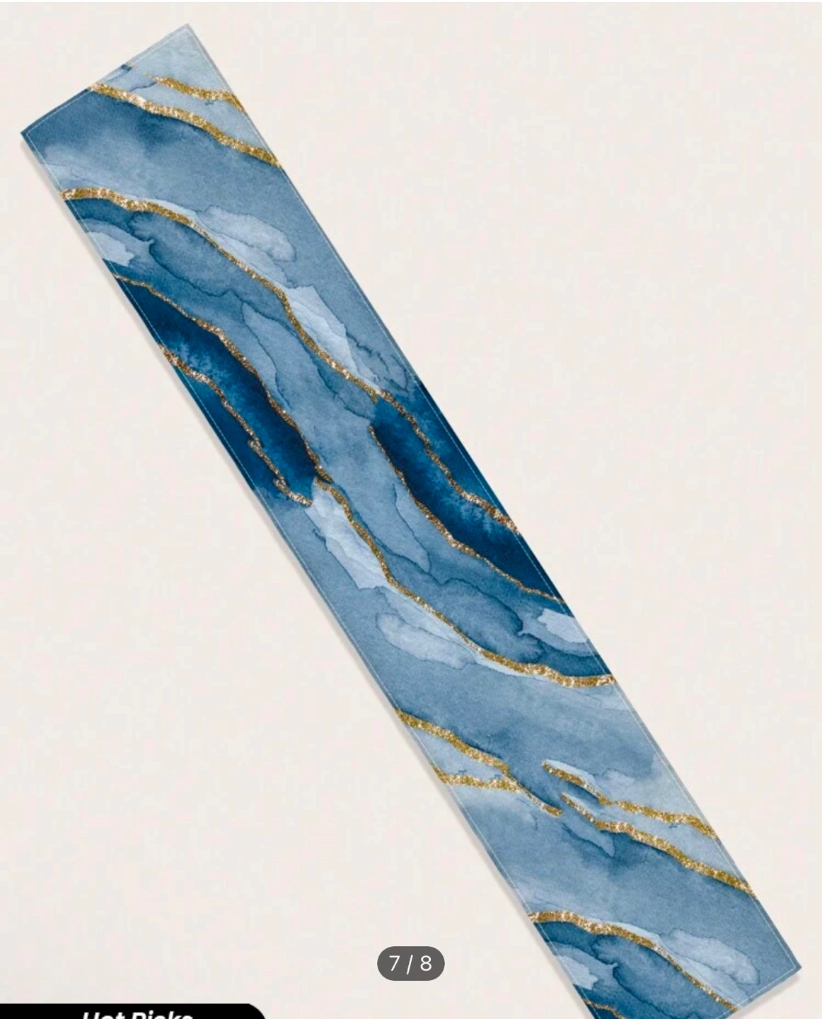 166Elegant table runner. Features a light blue watercolor design with gold foil accents. Linen material. Perfect for adding a touch of sophistication to your dining space or dresser.