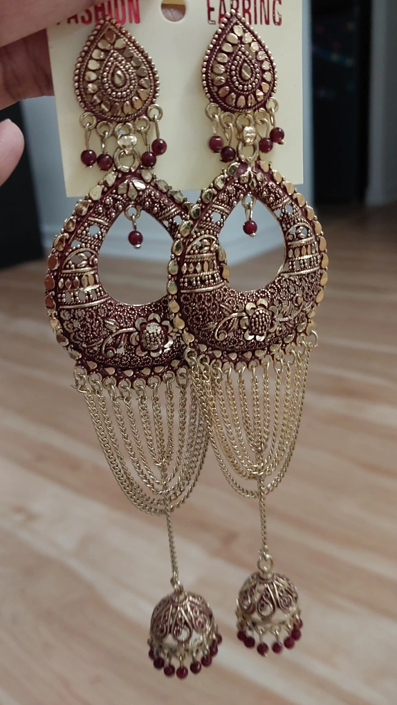 Beautiful maroon and gold statement earrings. Intricate detailing. Features dangling chains and jhumkas. Perfect for special occasions.