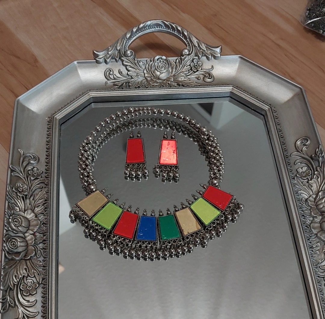 1000+Beautiful necklace and earring set. Features colourful rectangular pendants and small metal beads. Silver-toned metal. Statement piece. Smoke free and pet free home Kindly note all sales are final and no return or refund Please check my other listings aswell😊