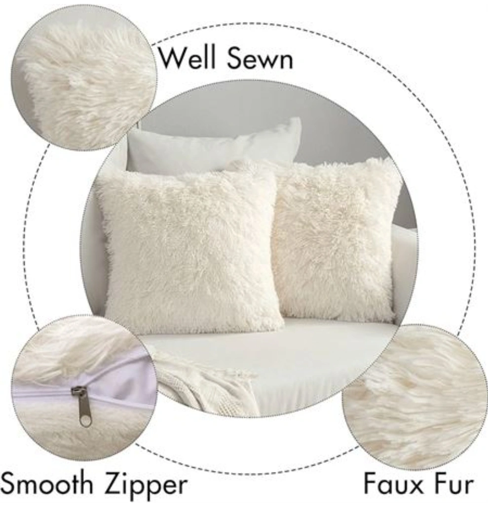 1000+Two off-white fluffy pillows covers. Soft faux fur. Zipper closure. Great for adding texture and comfort to your living space. P.S: These are covers pillow covers!