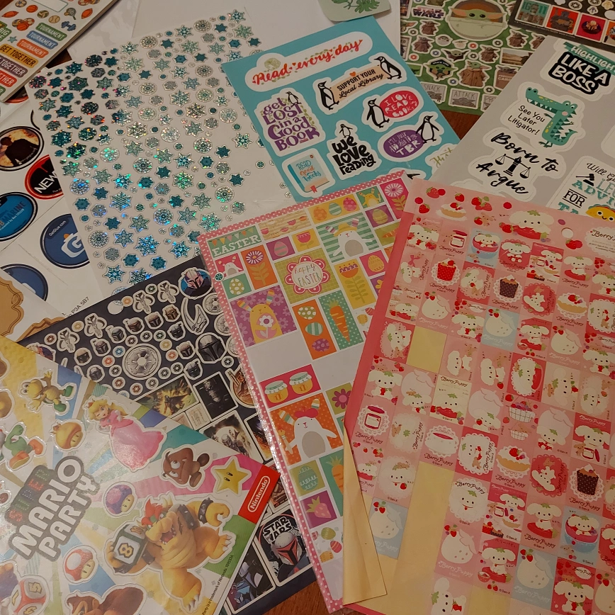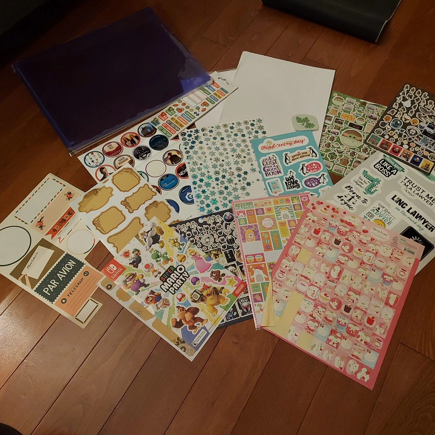 Decluttering some stickers. variety of stickers and packet of blank labels. some have been used. Must purchase all. Will come in the purple plastic sleeve. I might throw in a few more stickers when I meet you.