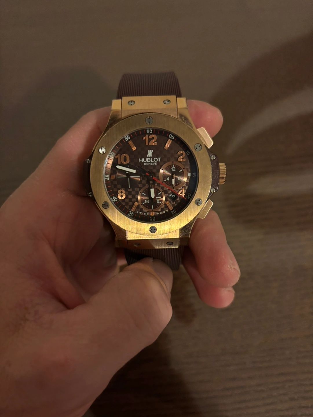 Rose gold Hublot Big Bang watch. Brown rubber strap. Limited edition. Automatic movement. Pre-owned.