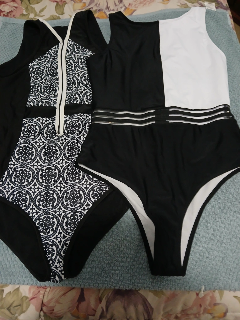 Two women's one-piece swimsuits. Black and white colour scheme that zip up. One features a black and white patterned bodice. The other is a colour-blocked design. Both appear to be size large around size 14. 12$ for patterned one worn once ,15$ for colour block one brand new one never worn. Lost weight don't fit Great for summer!