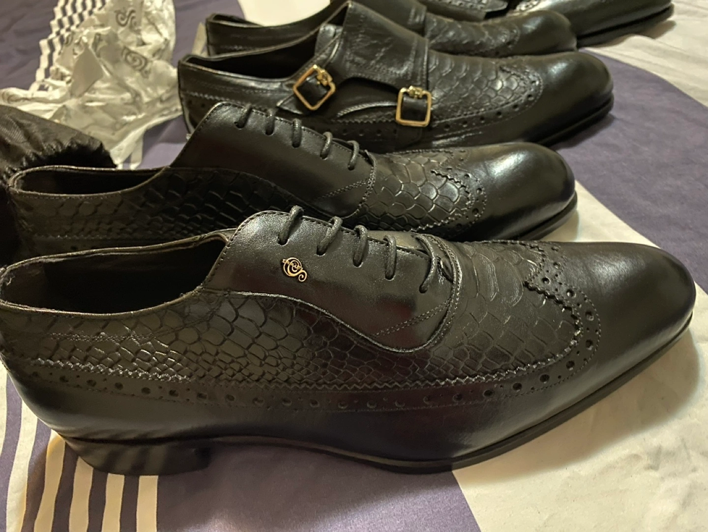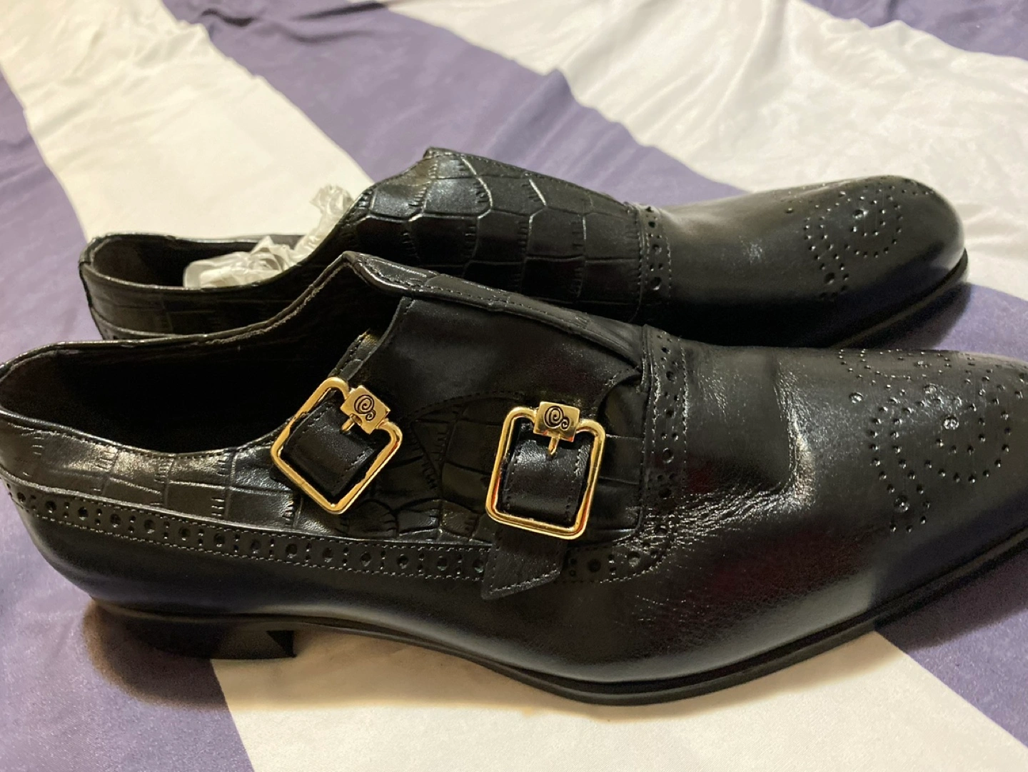 Men's formal shoes. Black leather. Double monk strap design. Crocodile-embossed leather. Wingtip detail. Gold-toned buckles. Excellent condition.