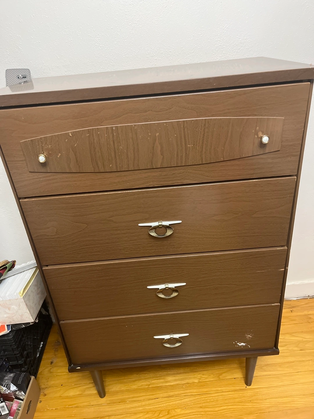 Four-drawer dresser. Brown wood veneer. Minor wear and tear. Mid-century style. Simple, elegant design. Perfect for bedroom or entryway.
