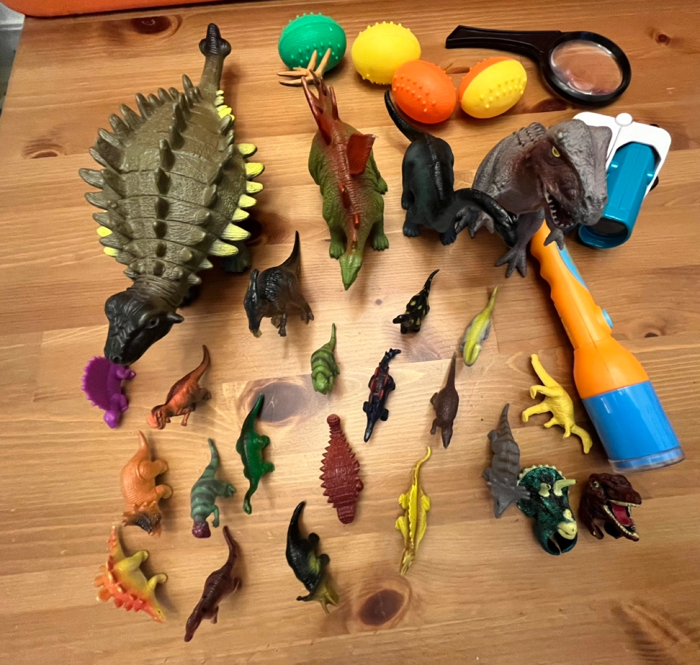 Collection of dinosaur toys. Includes various sizes and colours. Some larger figures, many smaller ones. Great for imaginative play or collecting. 2009 and 2005 with trademark on bigger Dino.