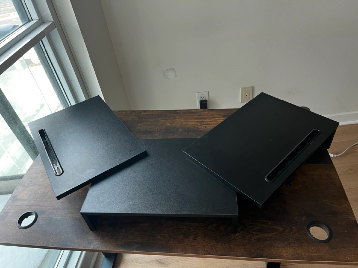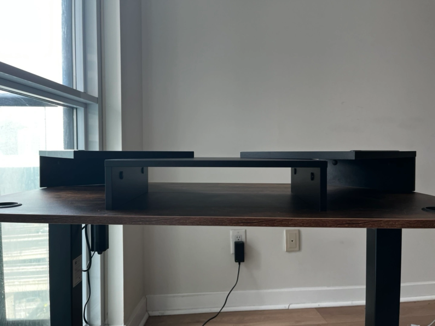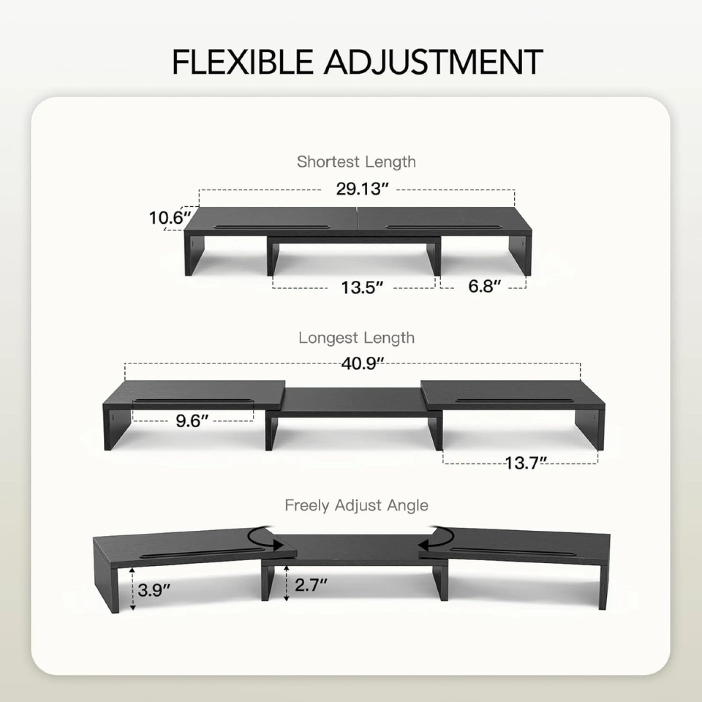 263***MOVING SALE*** As a ergonomic monitor riser stand, it could raise your computer monitor, tablet or laptop to an and keep screen at eye level, to reduce stress on shoulders and neck. This dual monitor stand has unique slots designed to hold tablets, phones. Adjust the length that you need between 29" to 43", put your monitors on stand with an ergonomic height, reduces eye strain and back pain.