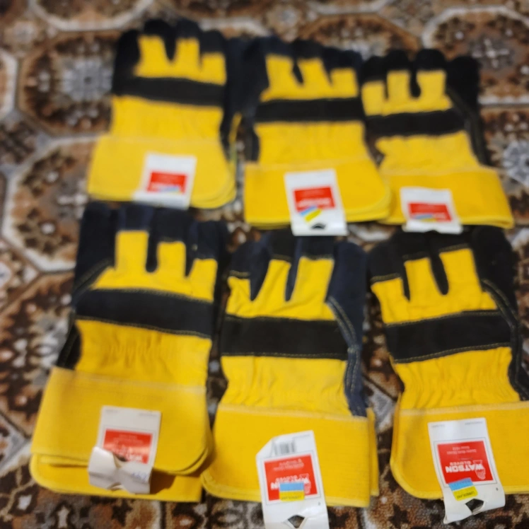 Eight pairs of work gloves. Yellow leather with black accents. Good for various gardening, contracting or construction jobs. giving th3m away for free. not being used. prefer to give them to someone who can used them.