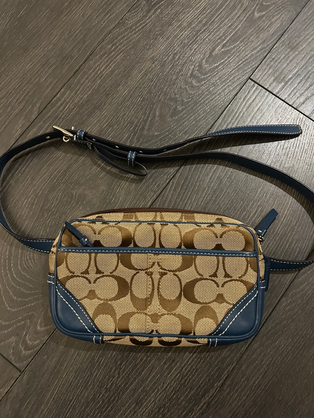 Brown signature canvas with blue leather trim. Adjustable belt. Small size, perfect for essentials.