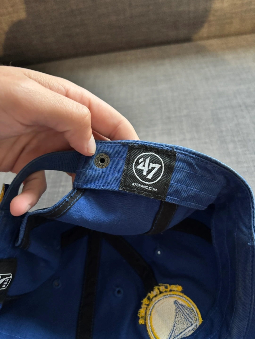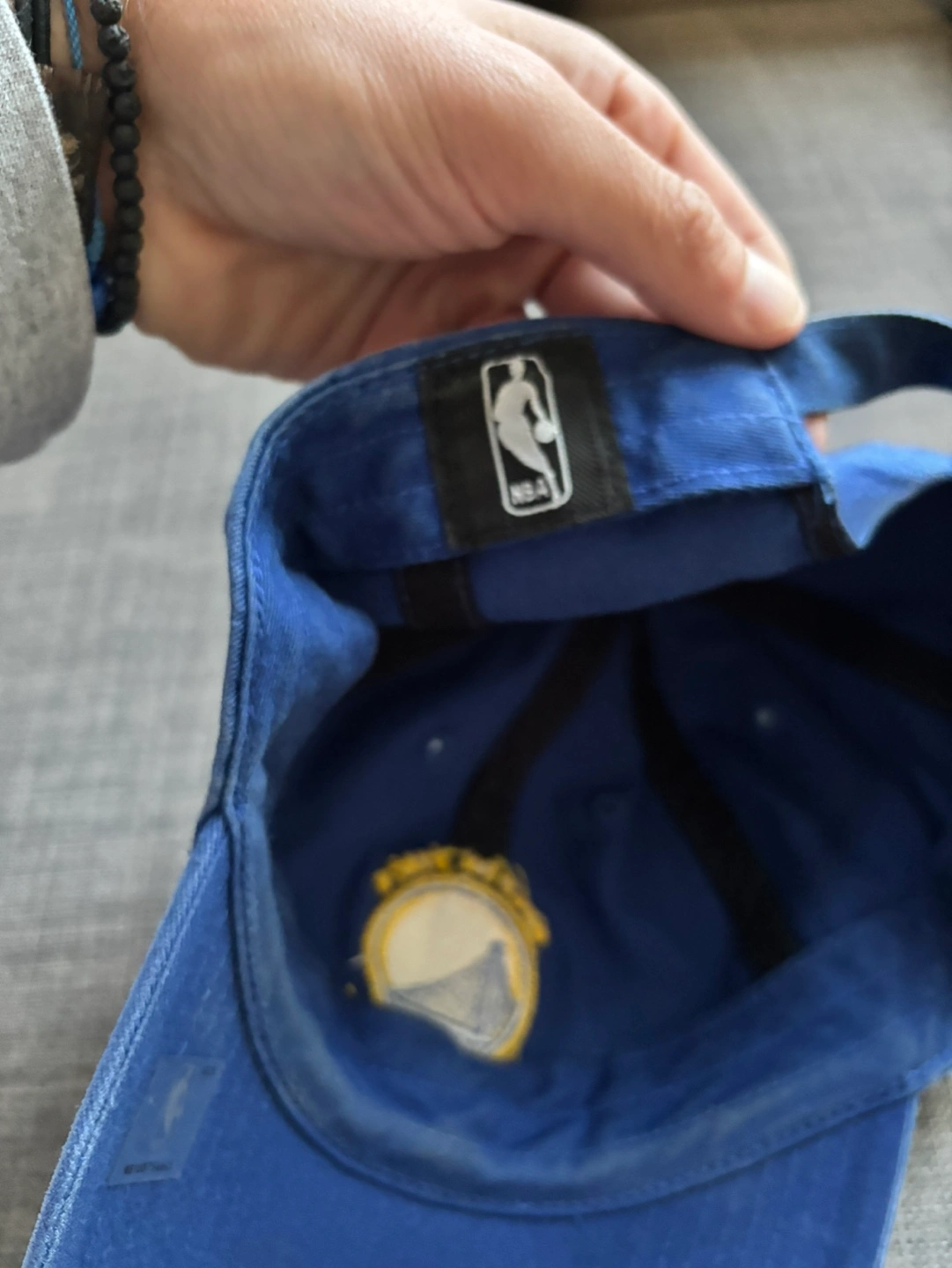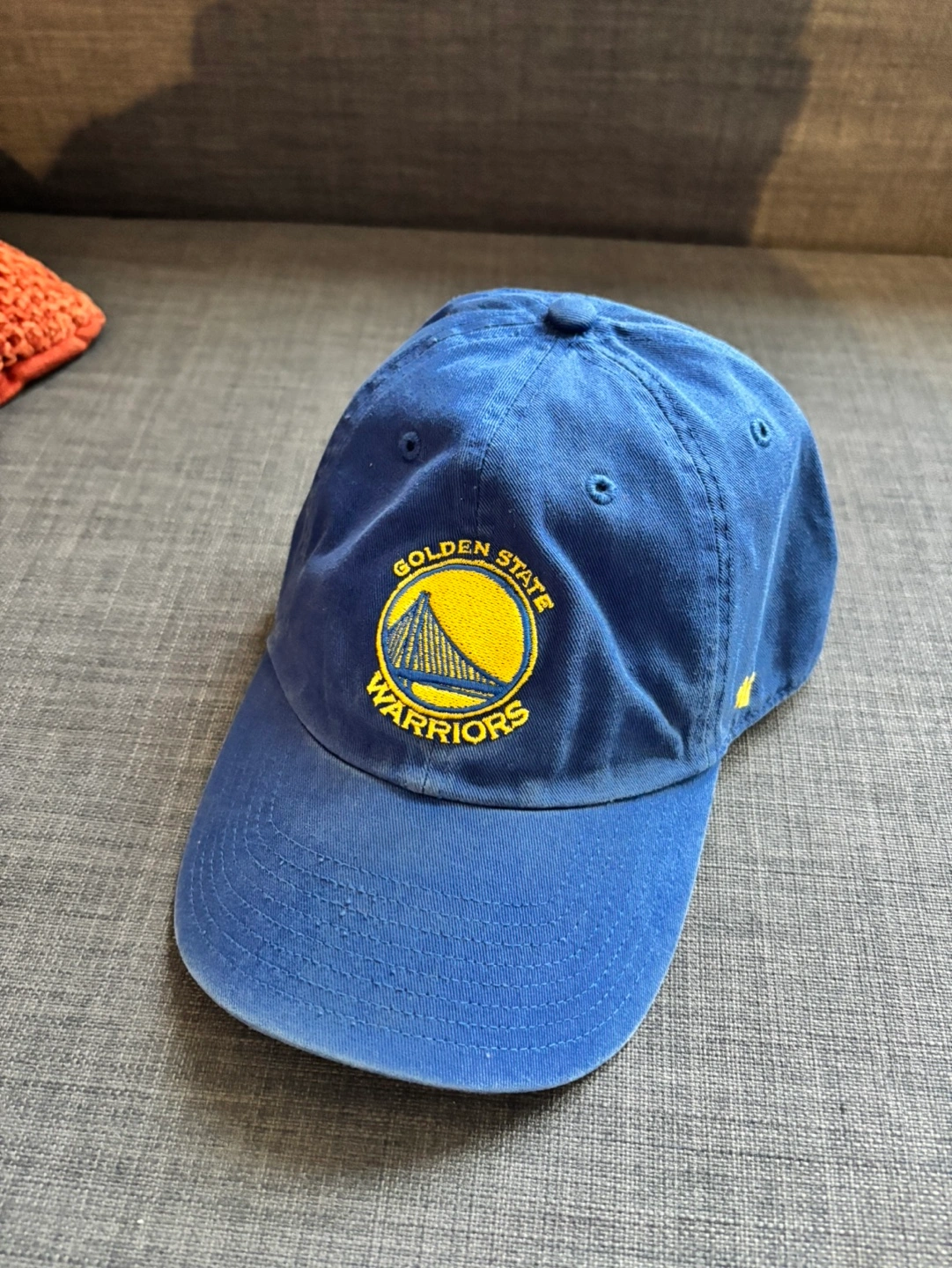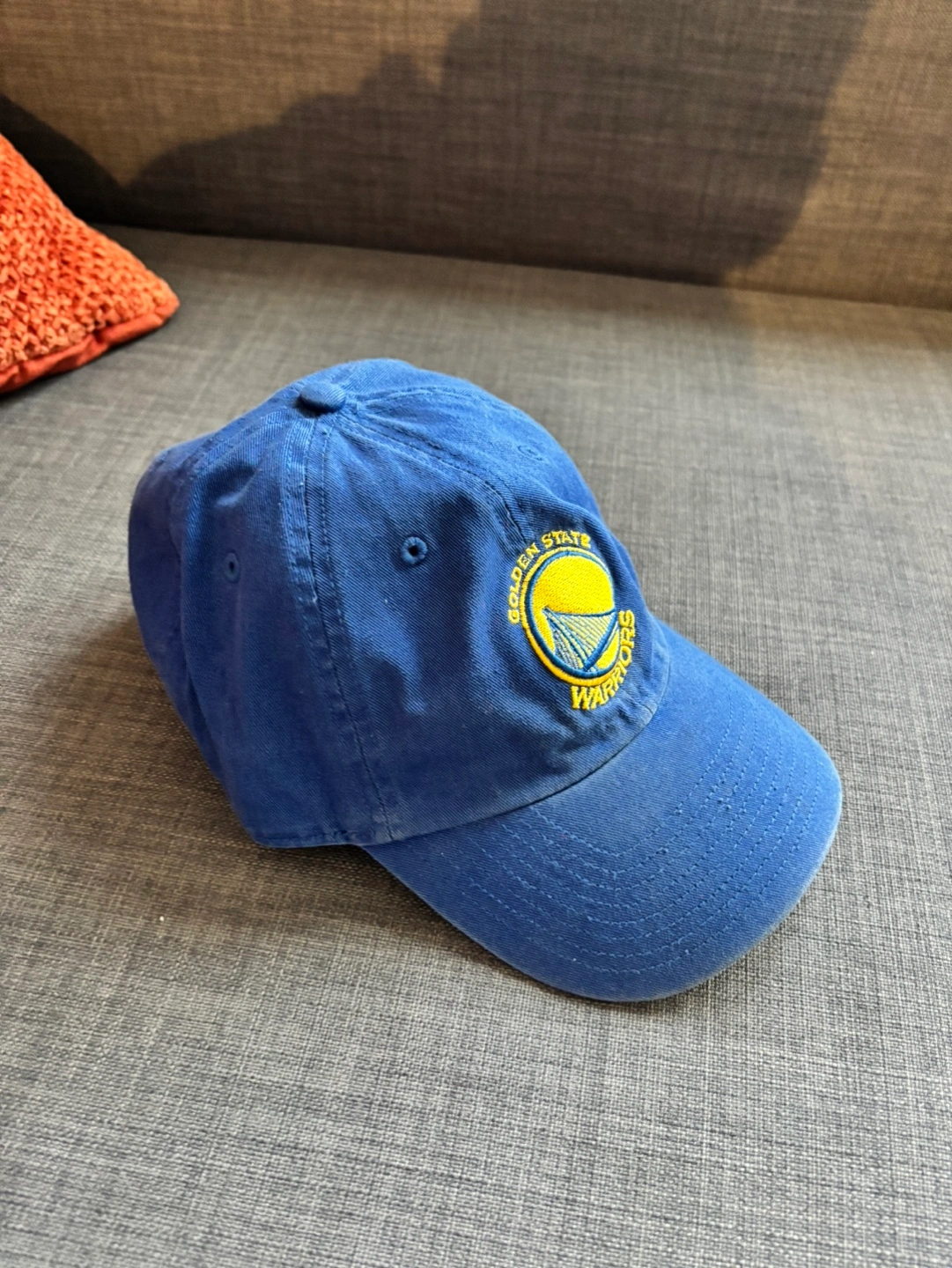 Adult-sized blue baseball cap. Features embroidered Golden State Warriors logo. Slight wear visible.