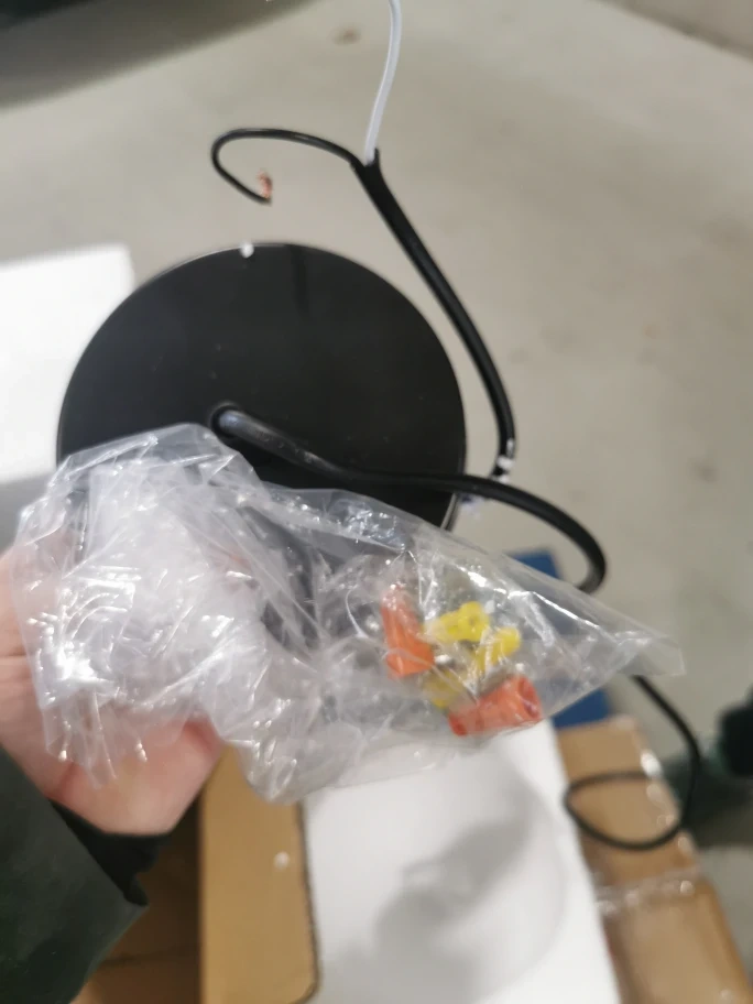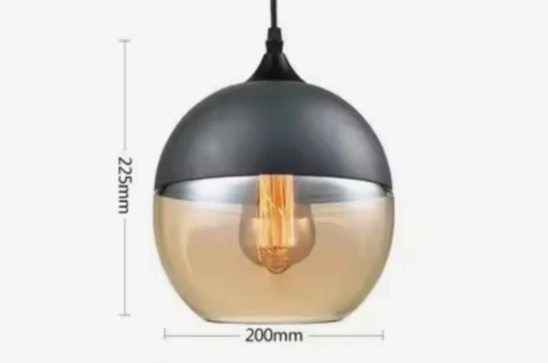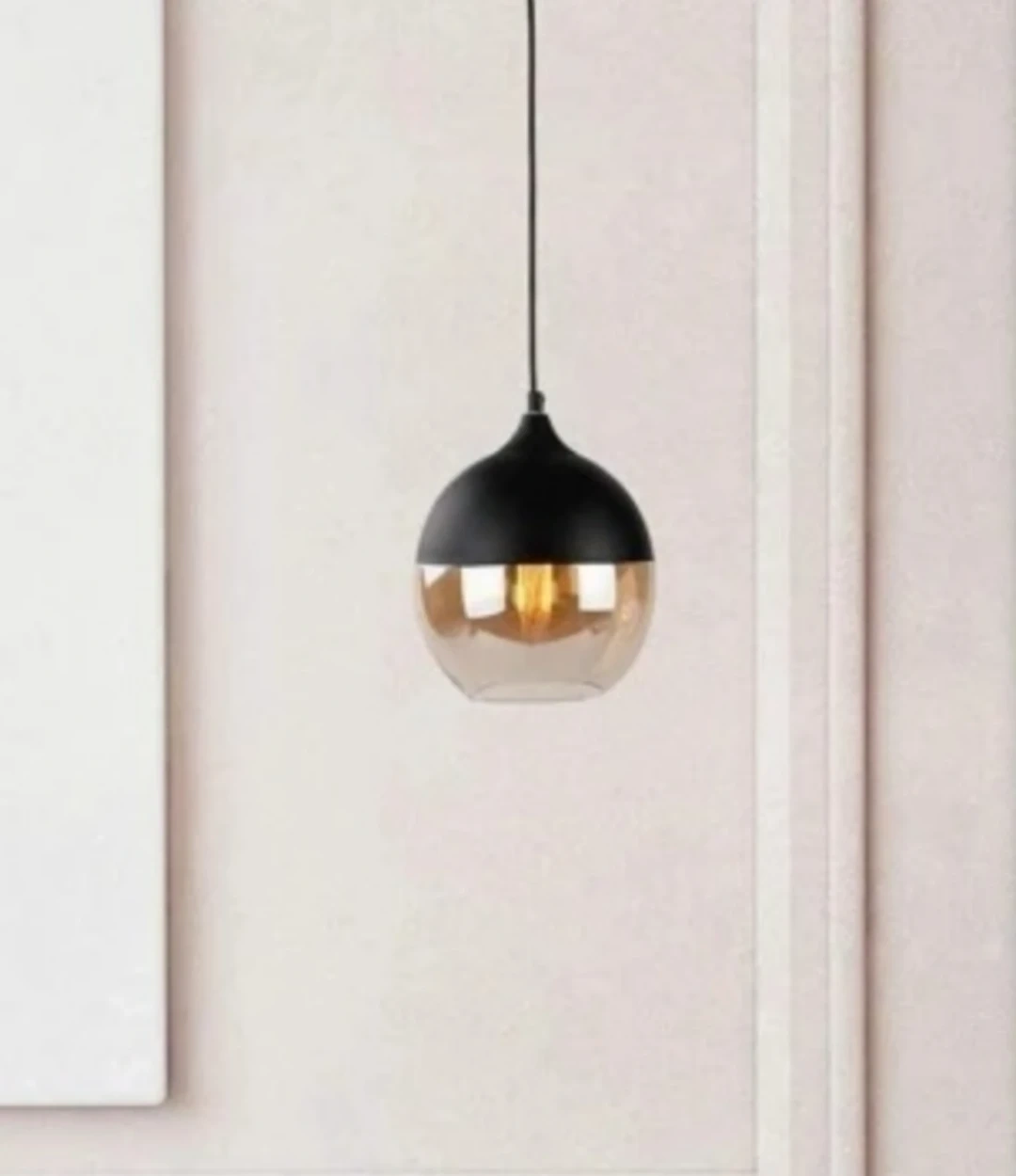 Sleek black metal pendant light. Amber glass globe shade. Includes wiring and connectors. Minimalist design, perfect for any room.