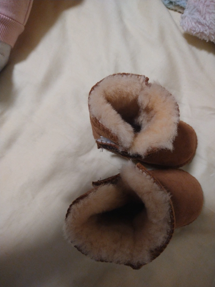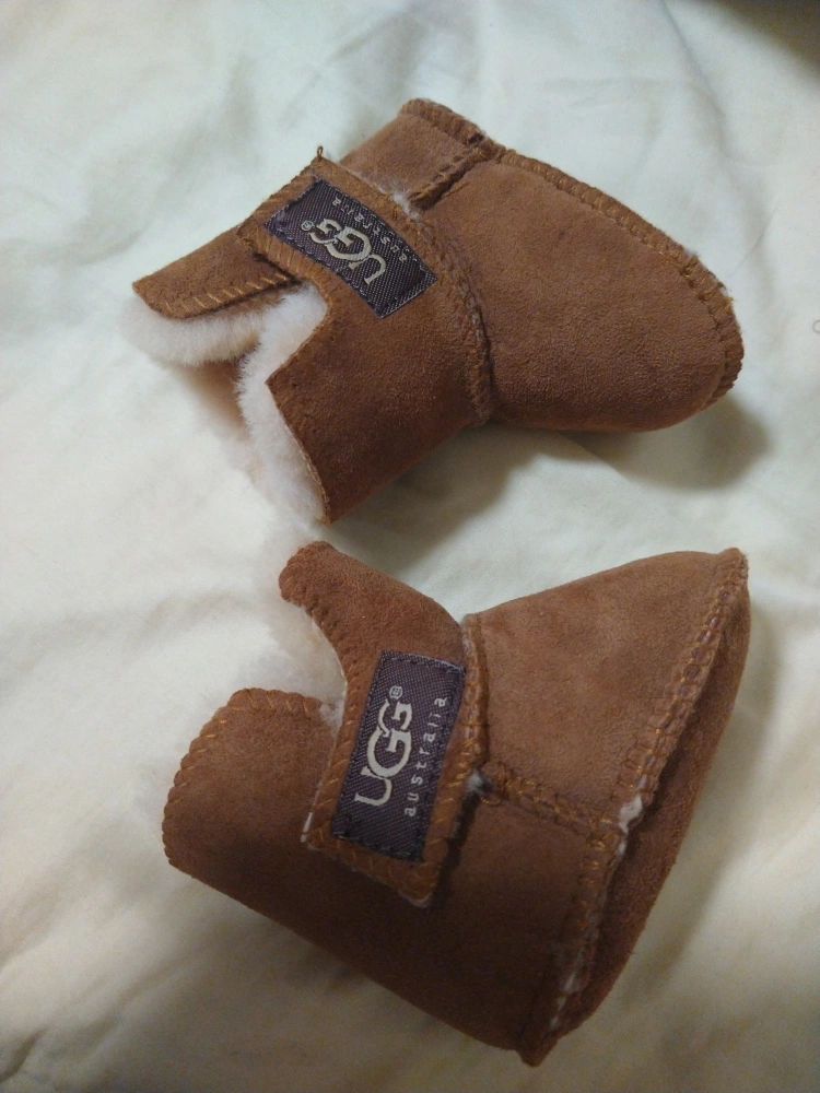 Adorable brown UGG Australia baby booties. Soft suede exterior, warm sheepskin interior. Perfect for keeping little feet cozy and warm. 0-6months.
