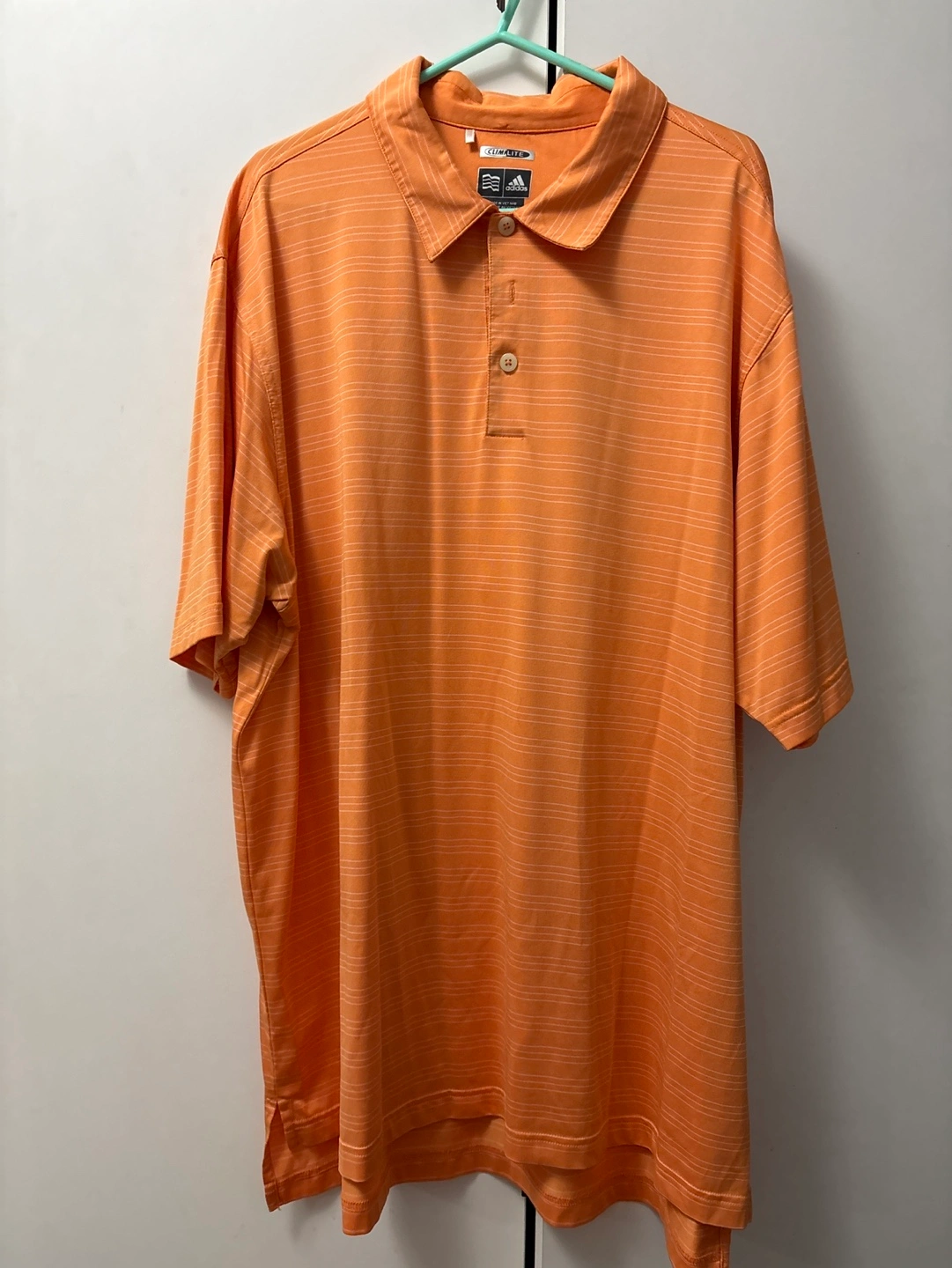 Men's short sleeve golf polo. Orange with thin white stripes. ClimaLite technology. Great for the course or casual wear.