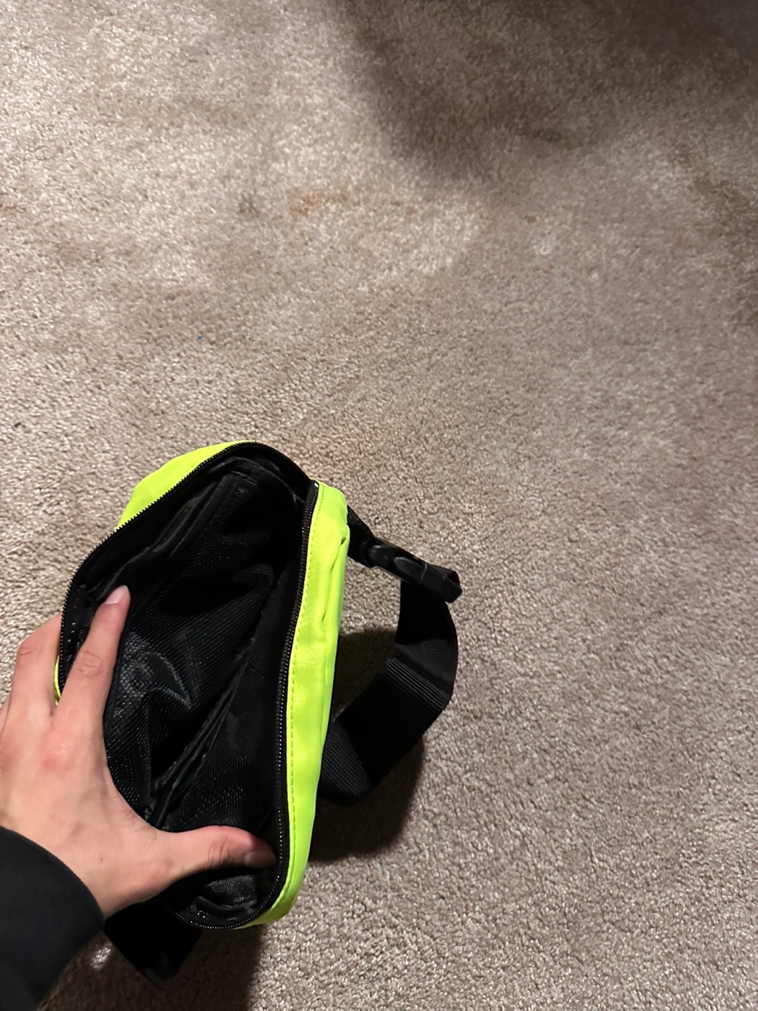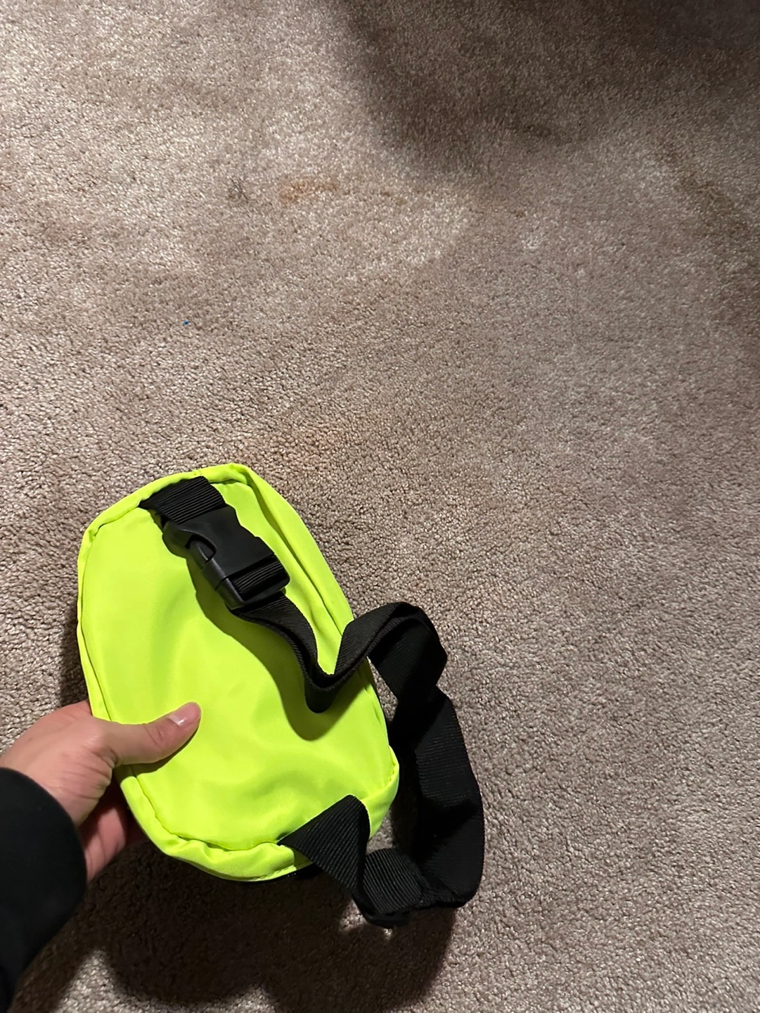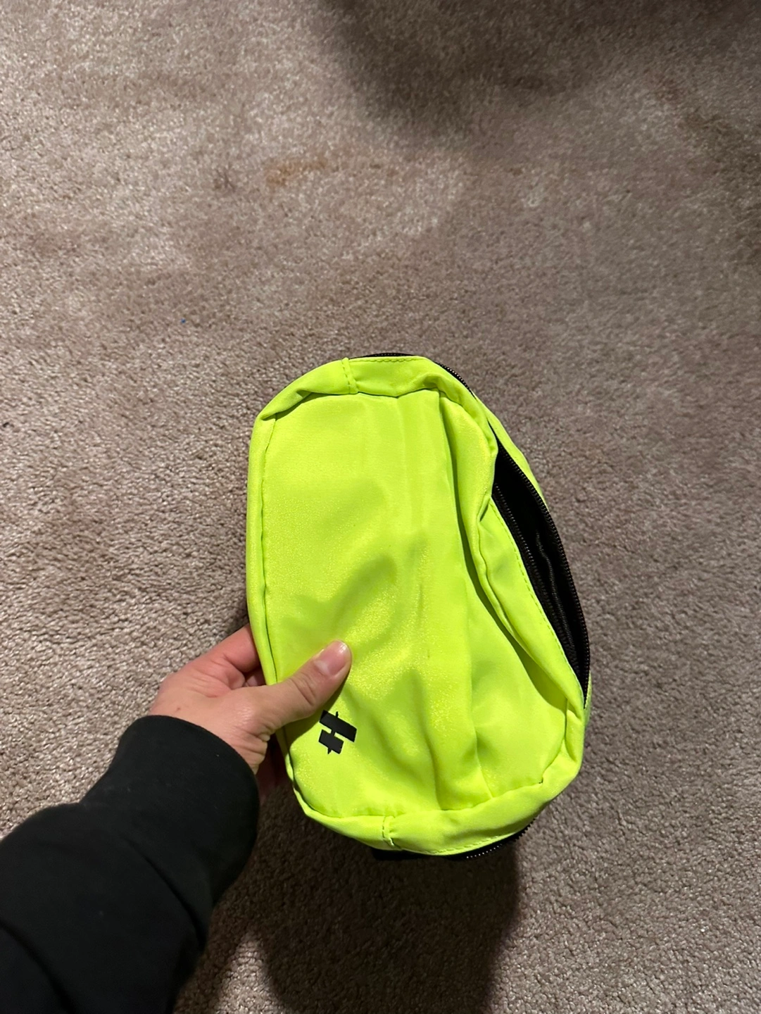 Small neon yellow waist bag. Adjustable strap. Black zipper and interior. HUF logo.