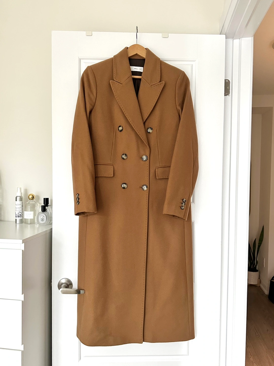 Longline double-breasted coat. Camel colour. Features long sleeves, button closure, and welt pockets. Excellent for colder weather.