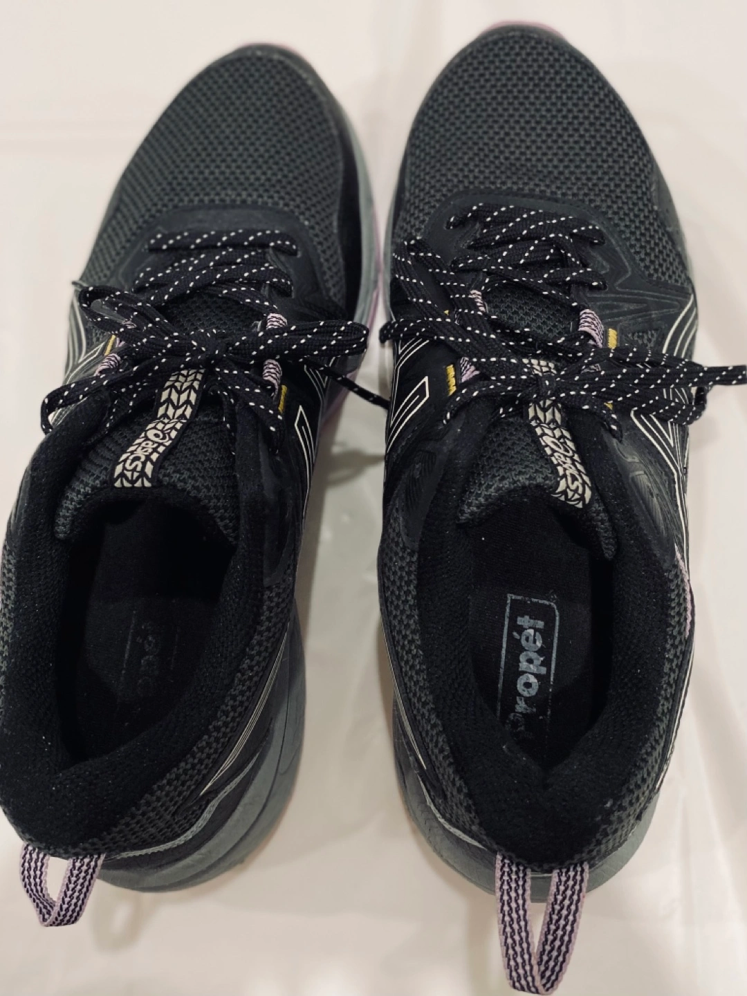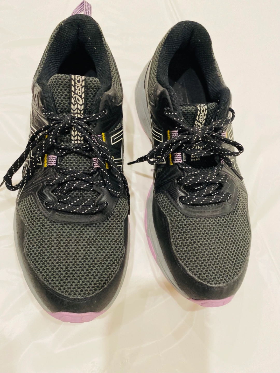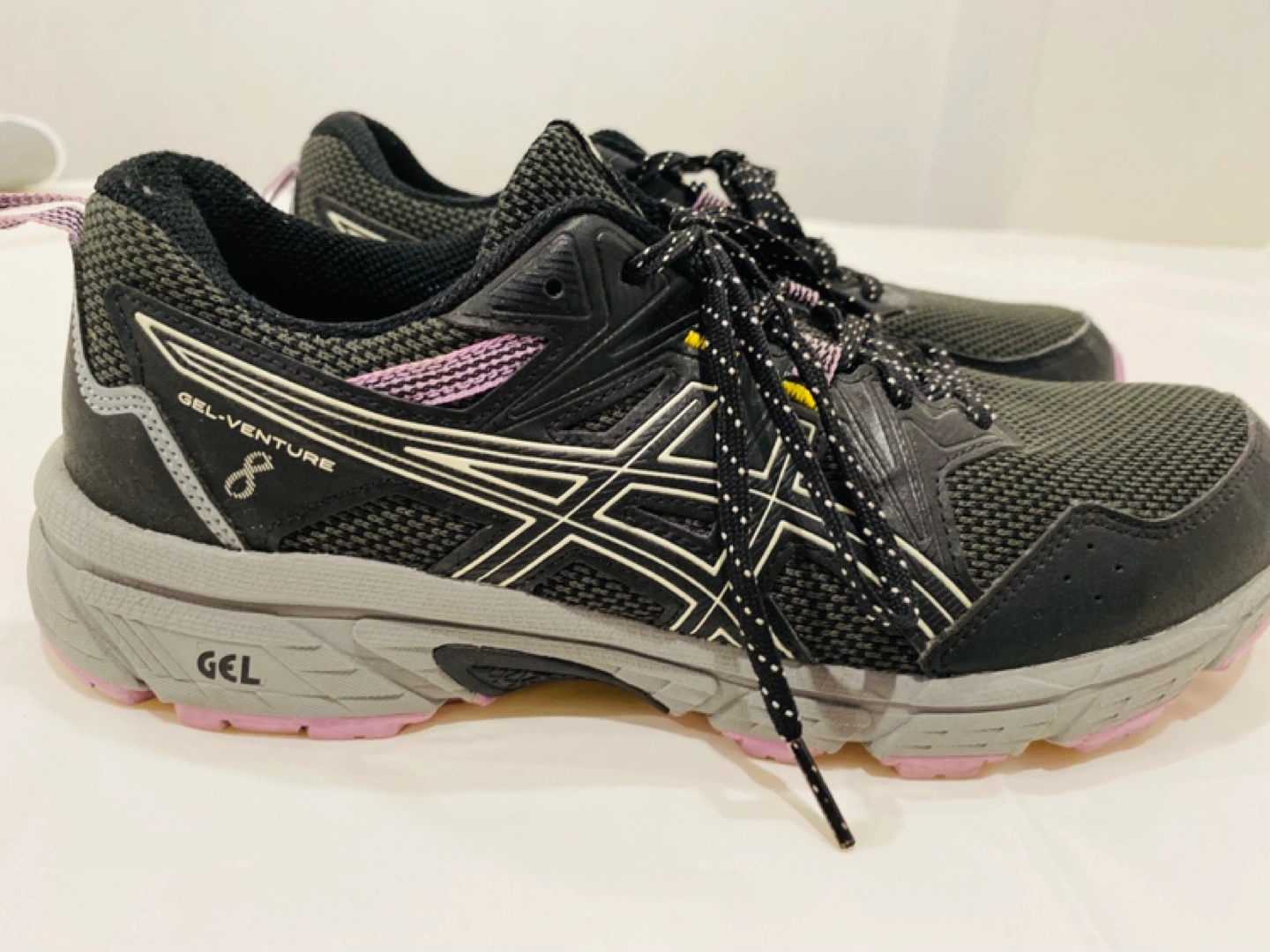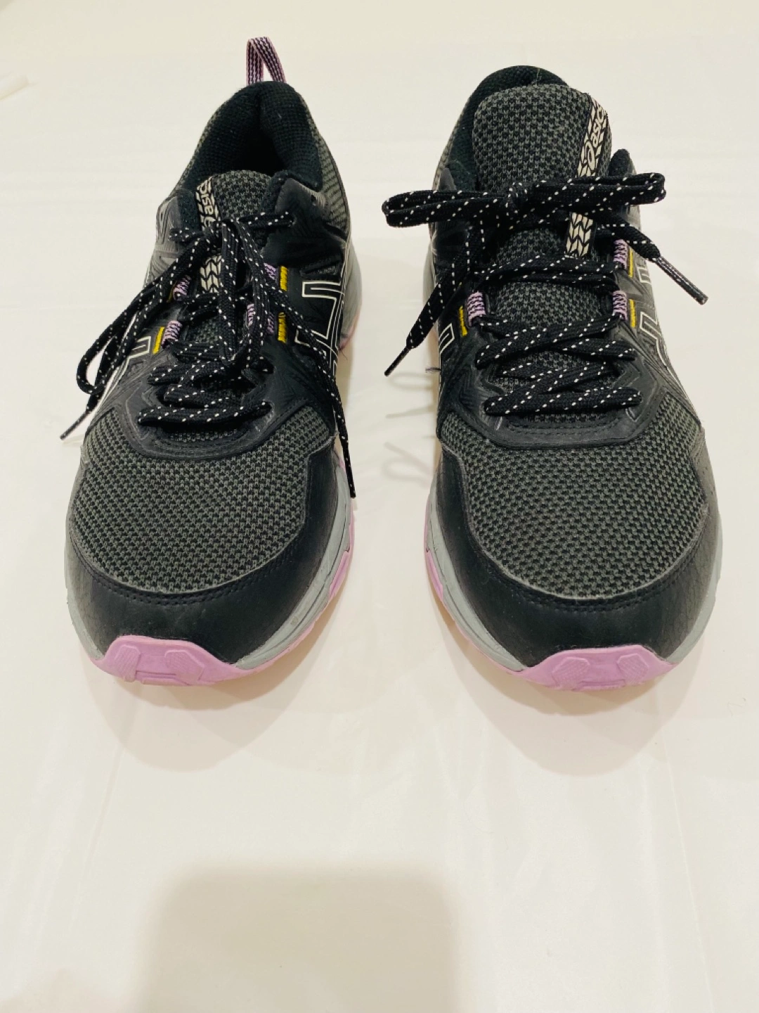 Women's Trail running shoes. Black with purple accents. Good for various outdoor activities. Lace-up closure. GEL cushioning. Durable outsole. Zapatos ASICS de MUJER Talla 9 BUENA CONDICIONES!