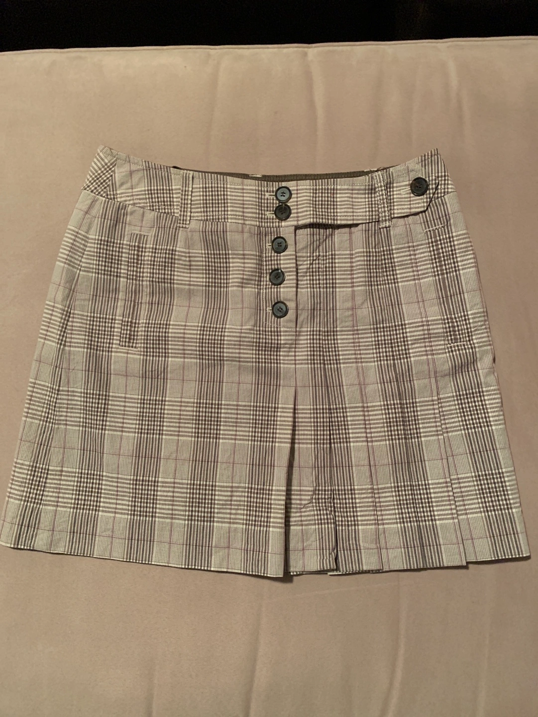 Women's skirt. Beige and brown plaid pattern. Left front side features pleats. Button closure. Skirt is lined. Size 6.