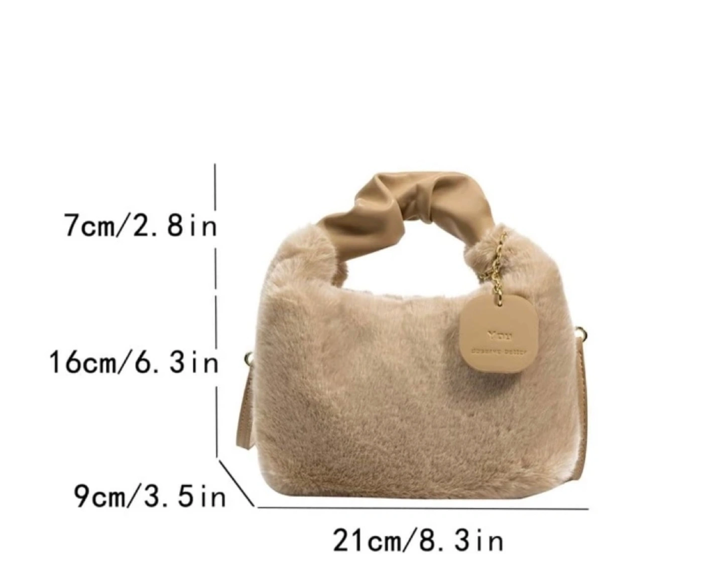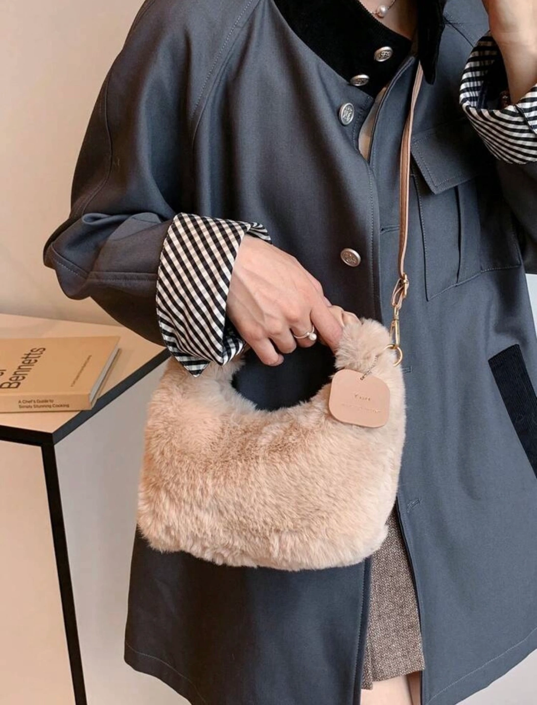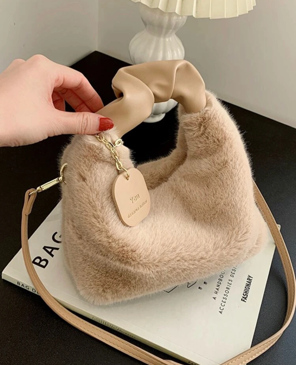 Small, stylish bag. Features soft faux fur exterior, beige colour. Includes a top handle and a detachable shoulder strap. Unique design with a small, decorative tag.