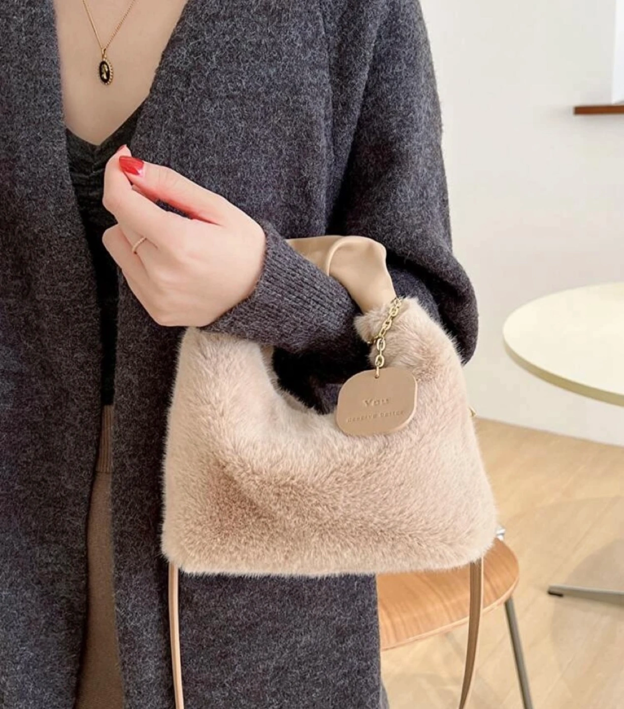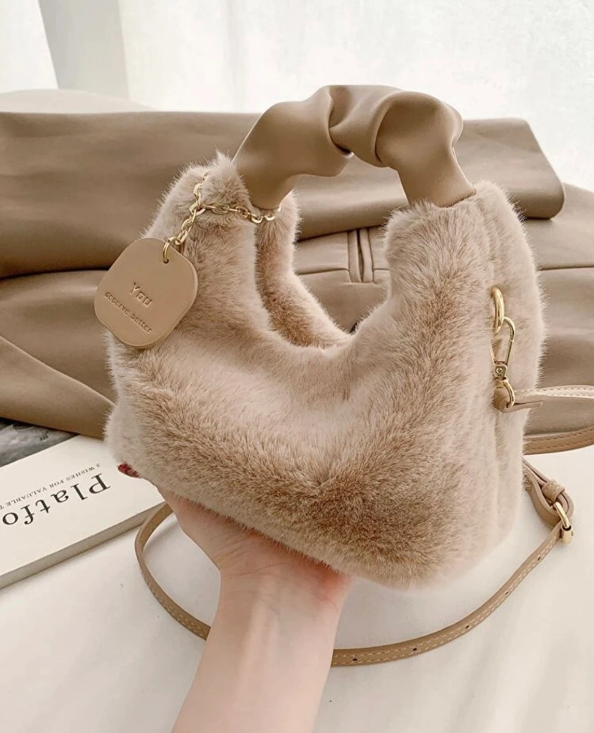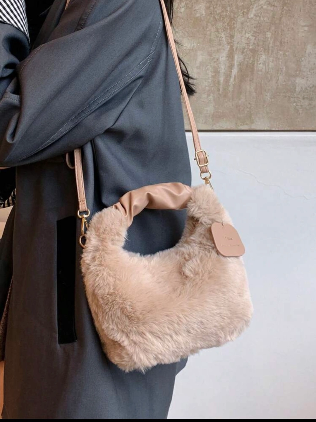 Small, stylish bag. Features soft faux fur exterior, beige colour. Includes a top handle and a detachable shoulder strap. Unique design with a small, decorative tag.