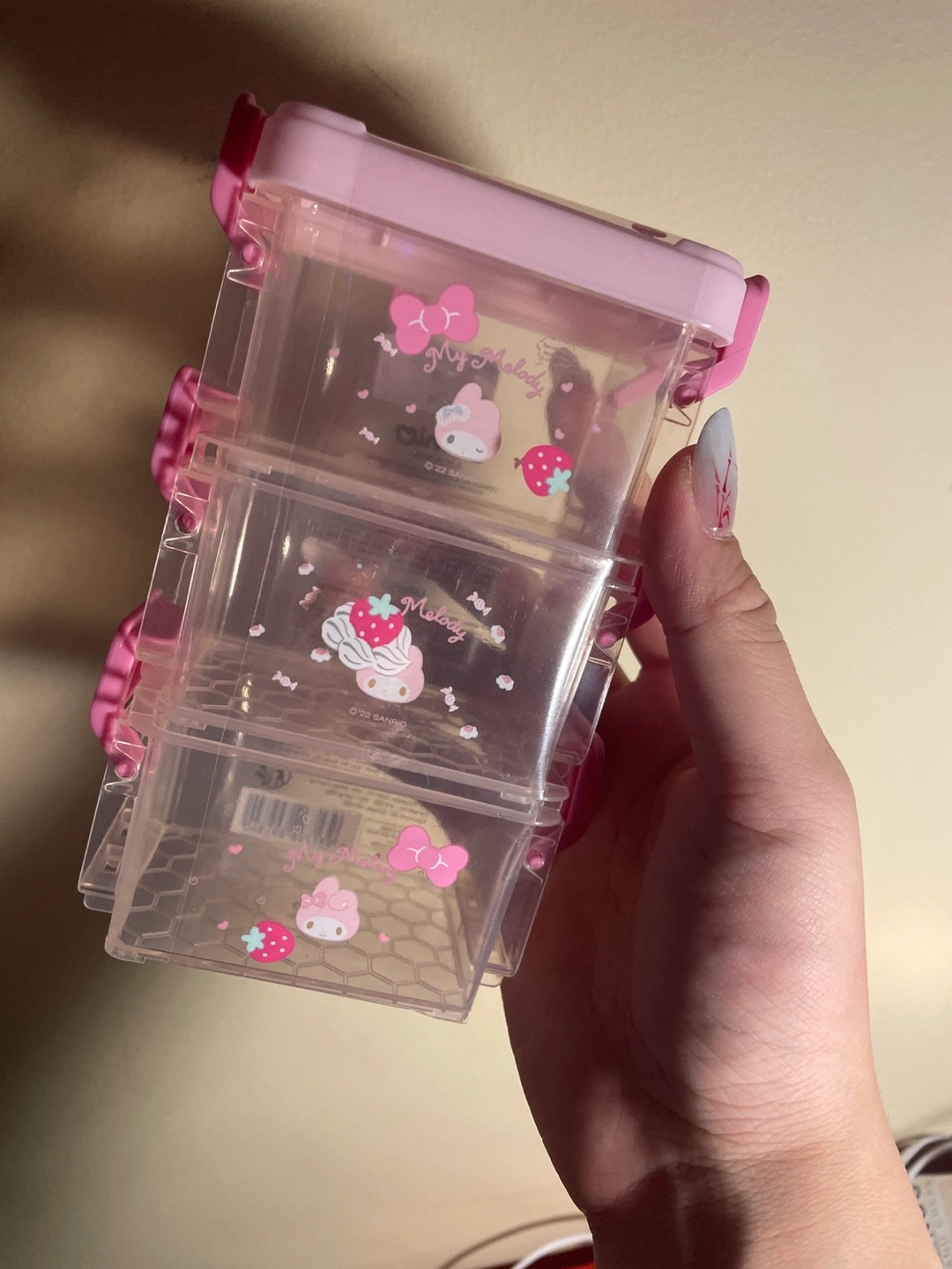 Cute pink and clear plastic storage container. Features My Melody character design. Three stackable drawers. Perfect for organizing small items.