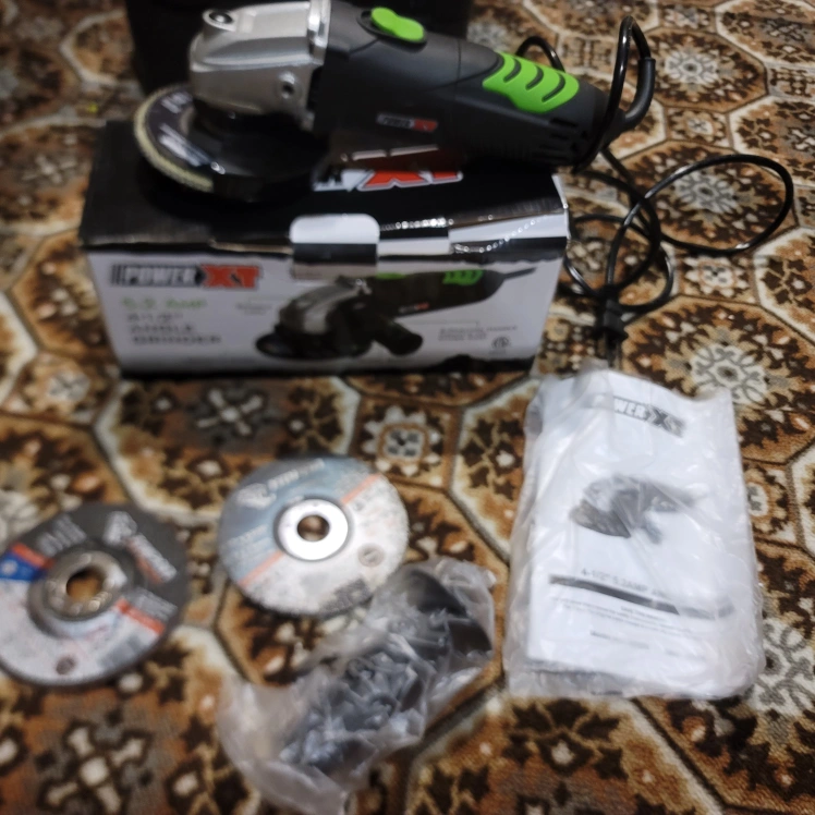 New 5.2 amp 4-1/2 inch angle grinder. Includes extra grinding wheels and instructions. Two-position handle, spindle lock, on/off switch. Excellent for DIY projects.