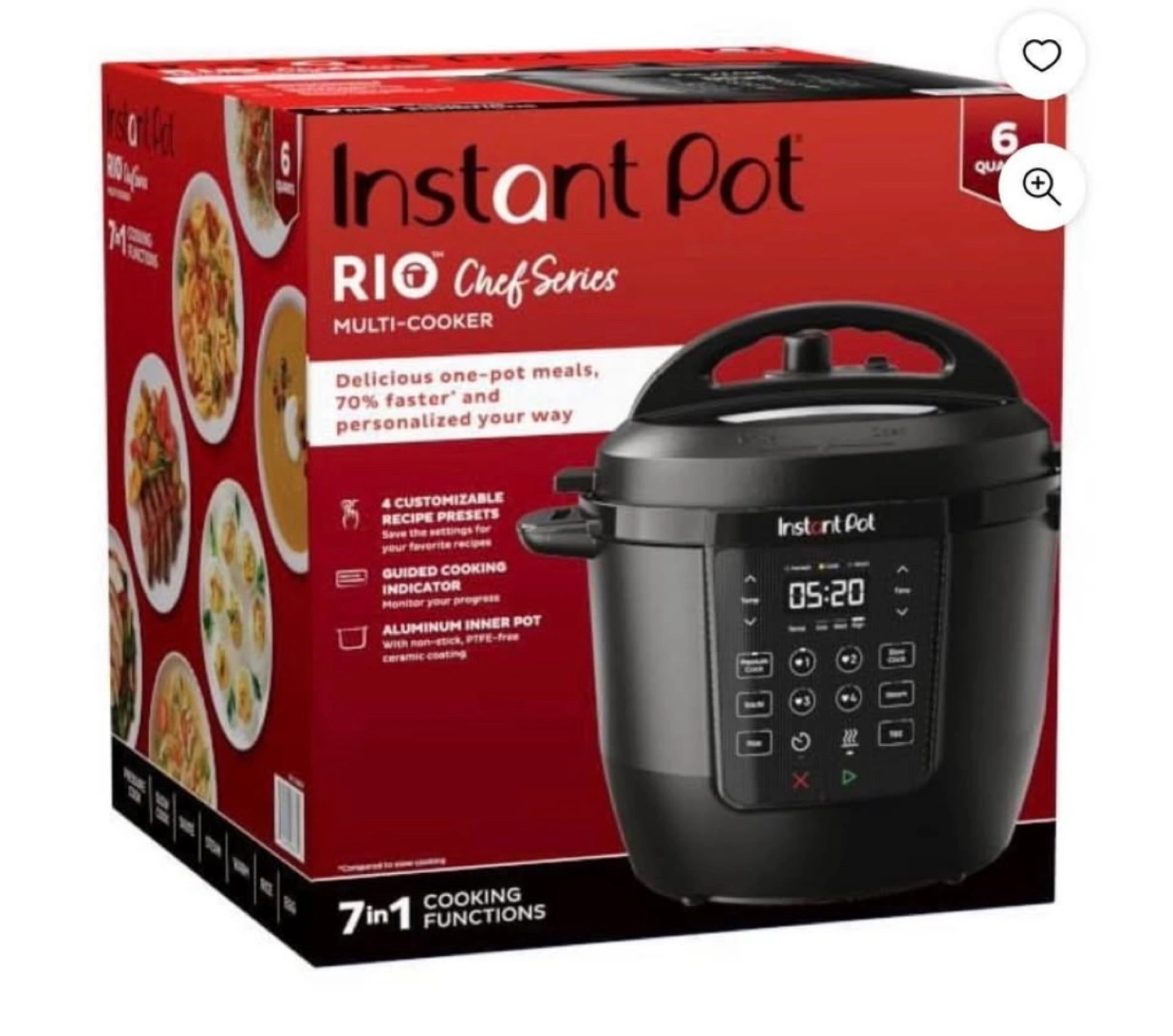 7-in-1 functionality. Pressure cook, slow cook, sauté, rice, steam, warm and egg. Includes customizable recipe sets. Guided cooking indicator. Aluminum inner pot, non-stick ceramic coating.