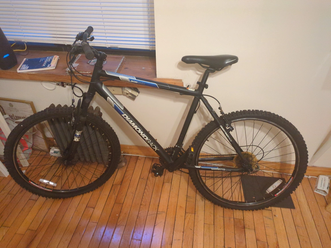 Mountain bike, black and blue frame. Good condition. Shimano components. 26 inch wheels. I've had it for 10 years in the garage and I'm selling it since I no longer use it.