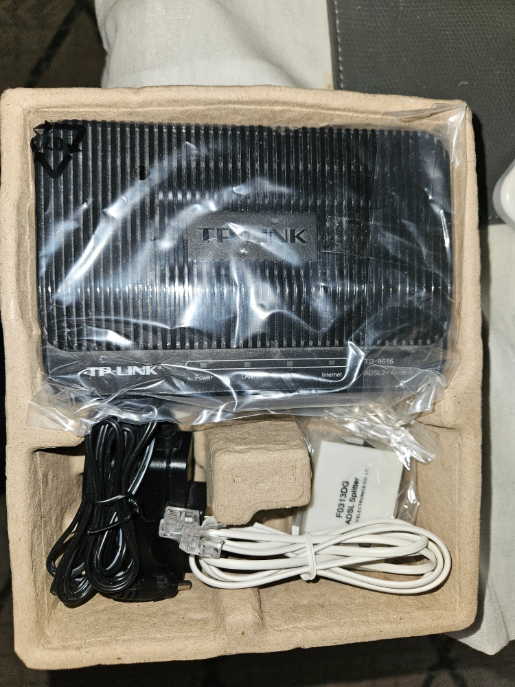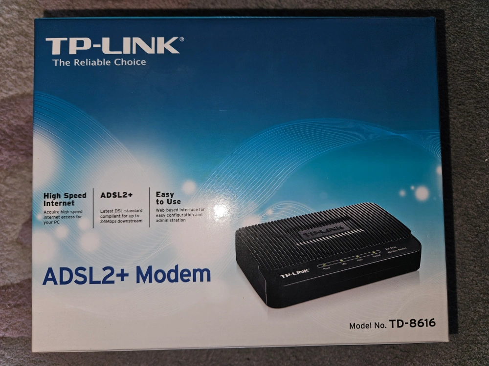 Brand new TP-Link TD-8616 ADSL2+ Modem. High-speed internet access. Easy to use web-based interface. Includes power adapter and cables. Includes original packaging.